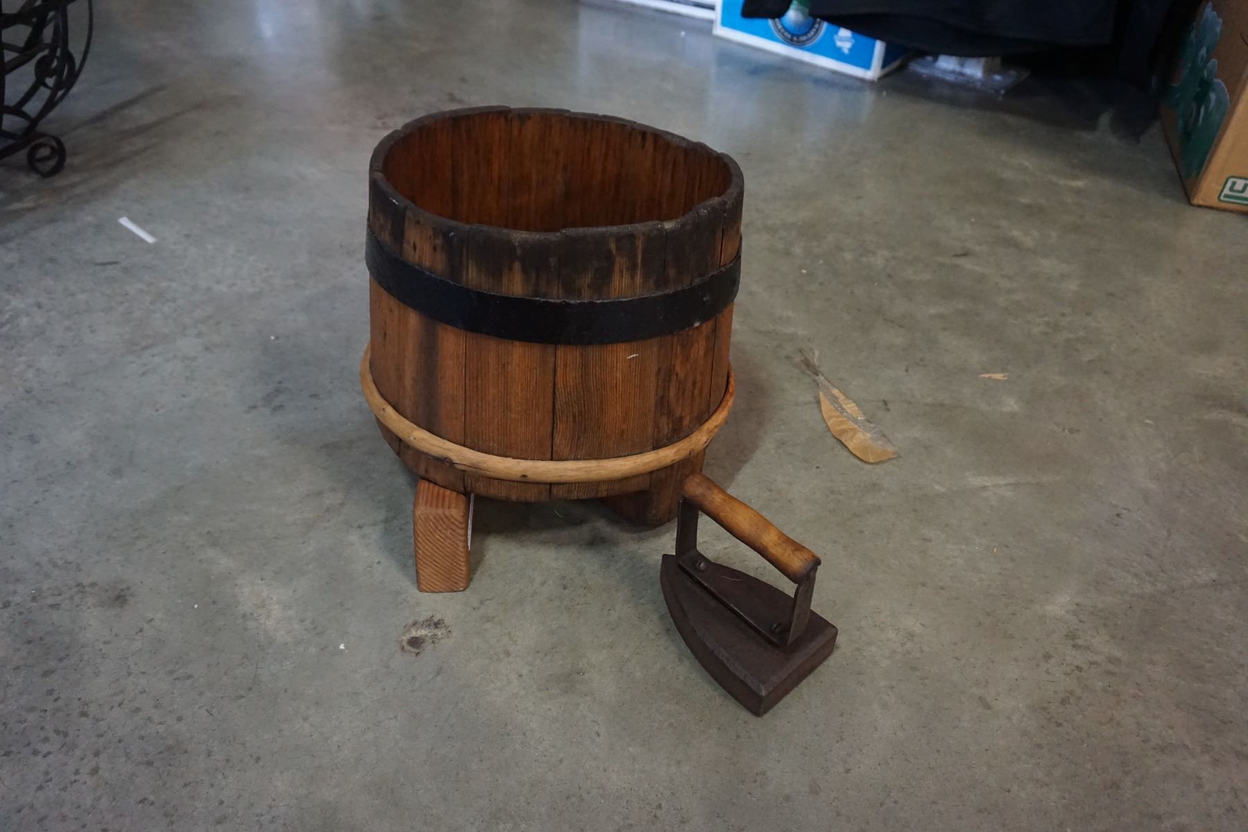 ANTIQUE CASK/KEG ON STAND AND IRON