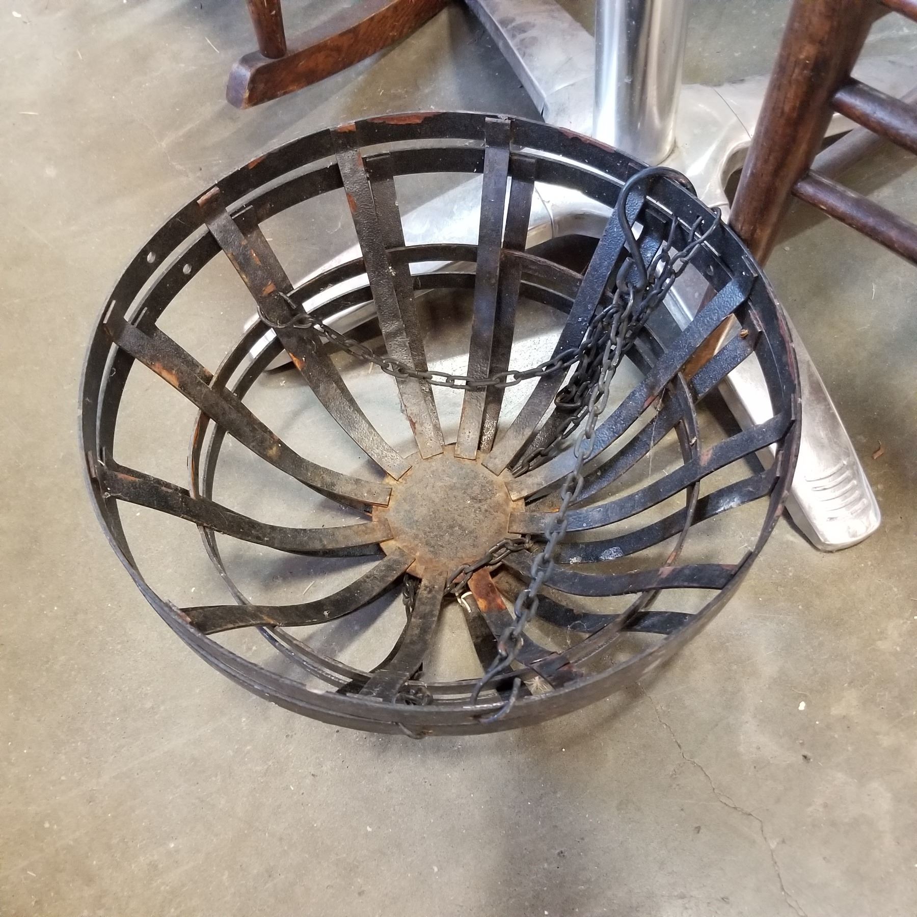 ANTIQUE CAST IRON GRATE AND 2 METAL BLACK HANGING BASKETS