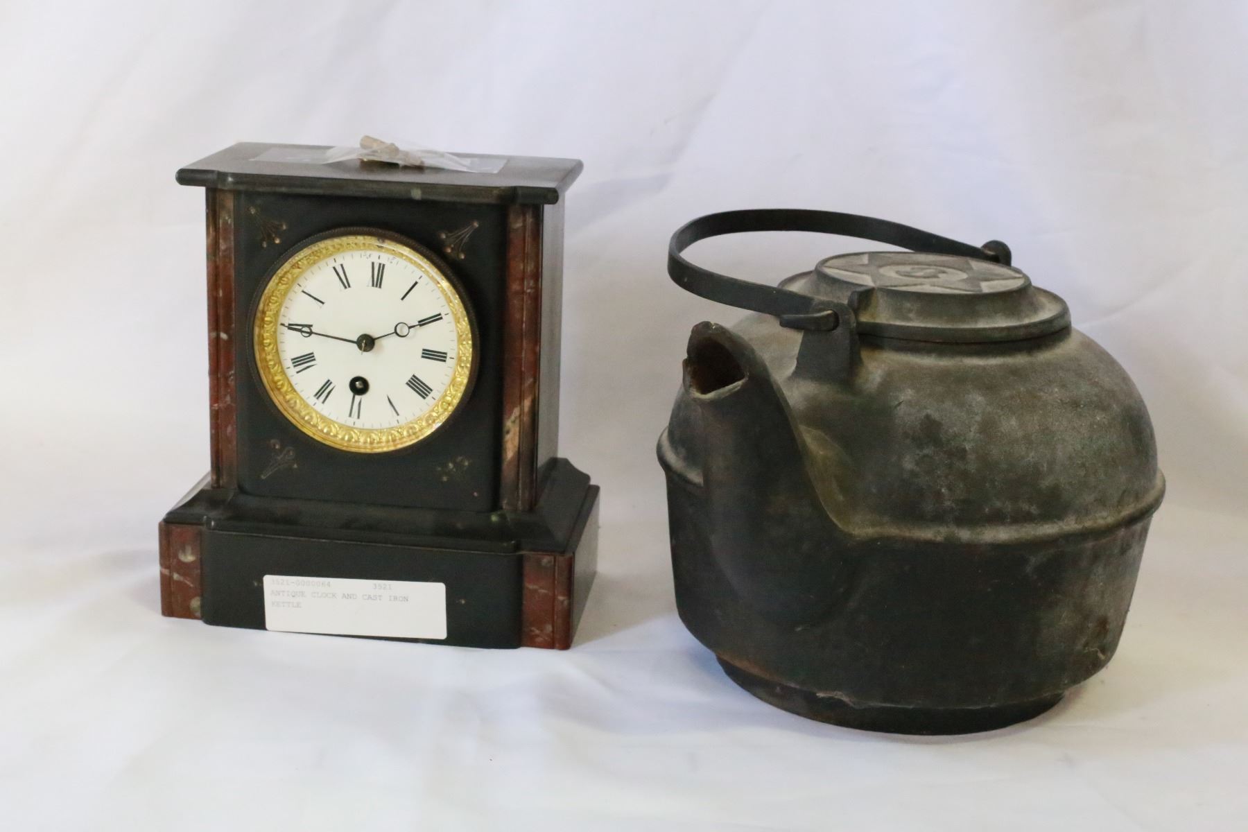 ANTIQUE CLOCK AND CAST IRON KETTLE