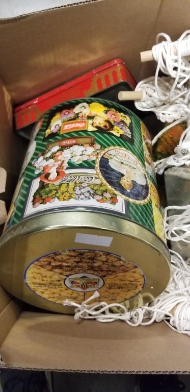 ANTIQUE COLLECTIBLE TINS, MACRAME ITEMS ETC