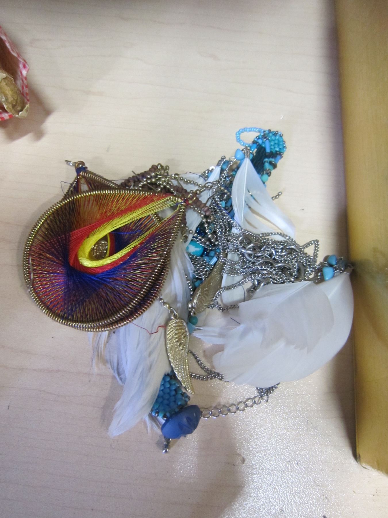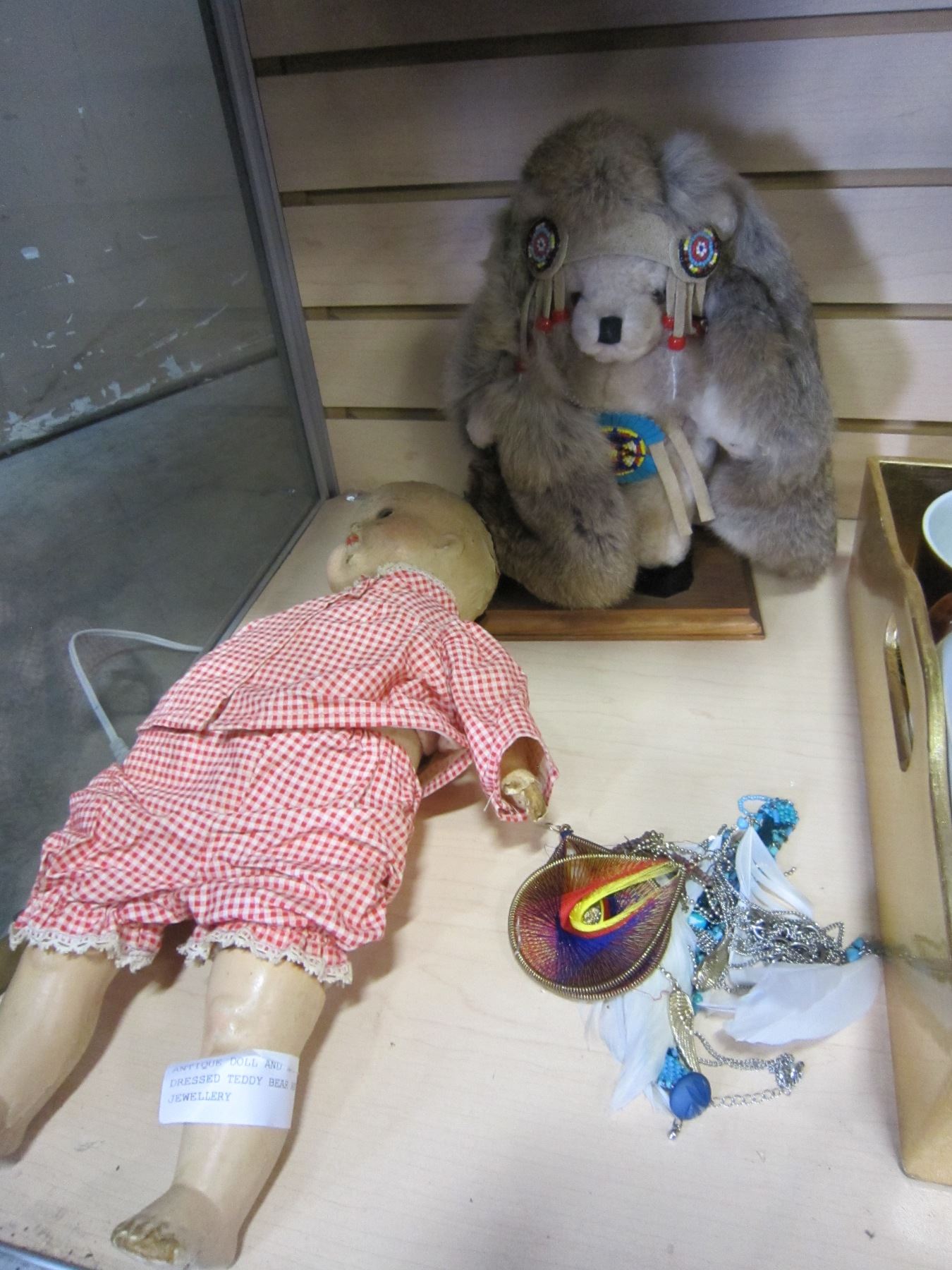 ANTIQUE DOLL AND NATIVE DRESSED TEDDY BEAR AND JEWELLERY
