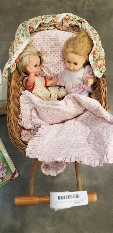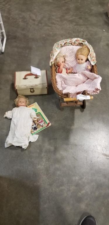ANTIQUE DOLL PRAM W/ DOLLS AND CASE W/ CLOTHES