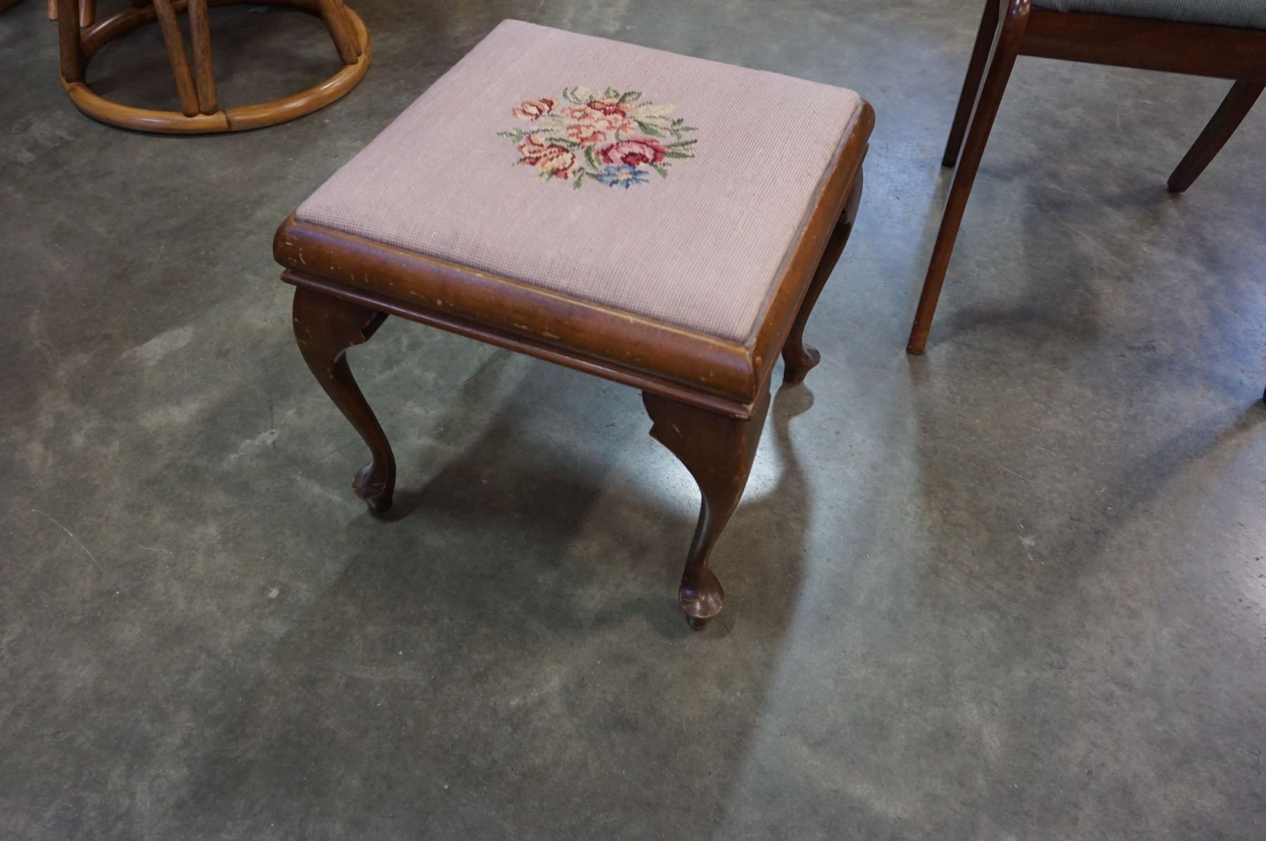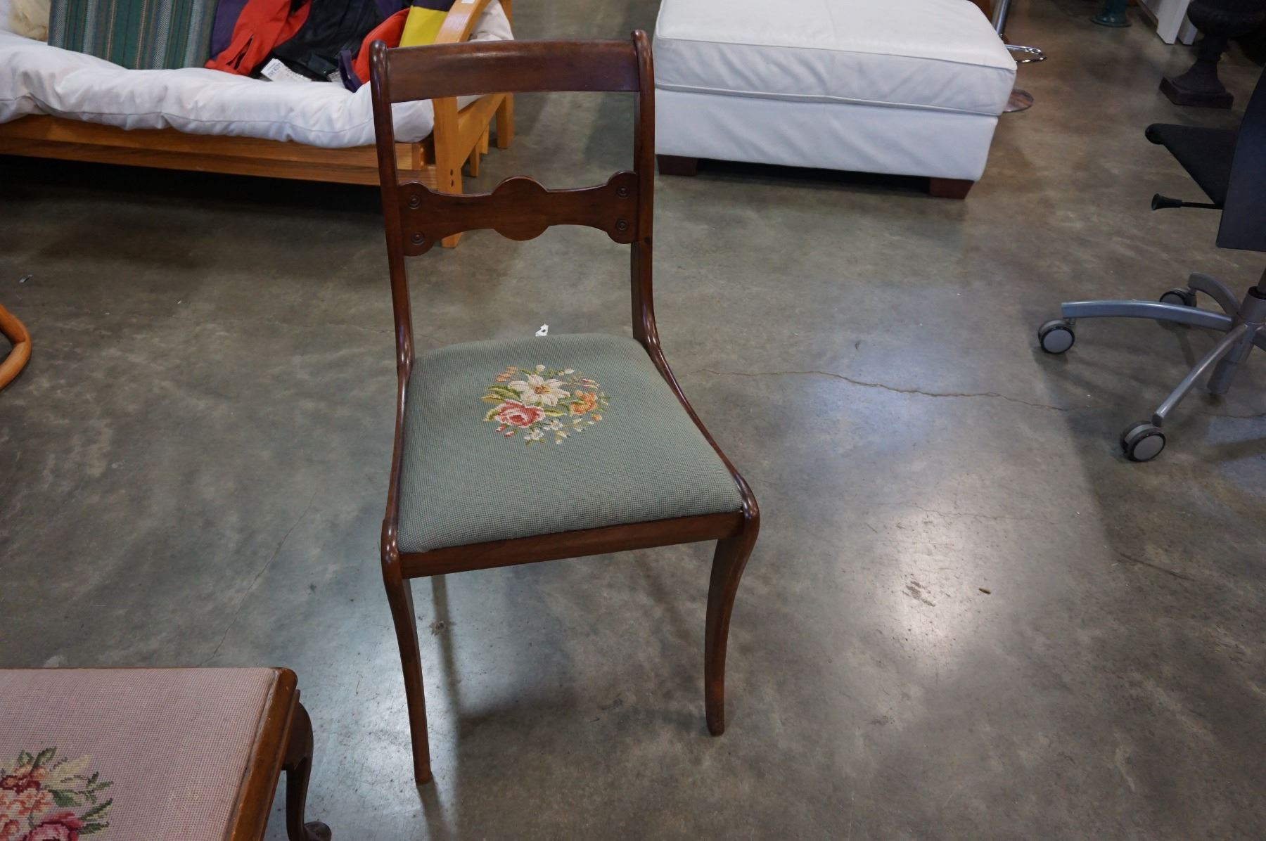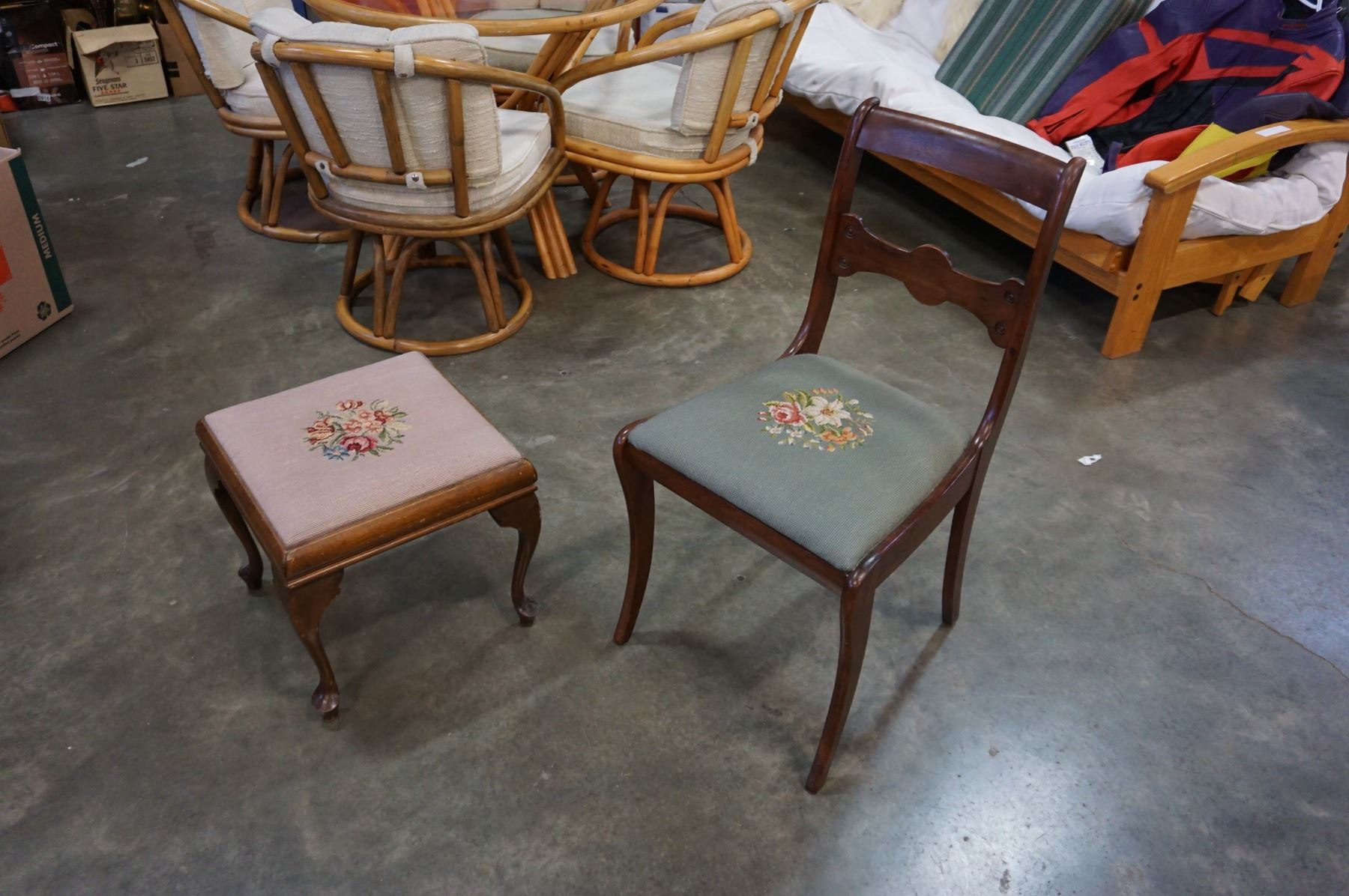 ANTIQUE DUNCAN PHYFE NEEDLE POINT SEAT CHAIR AND QUEEN ANNE NEEDLE POINT FOOT STOOL