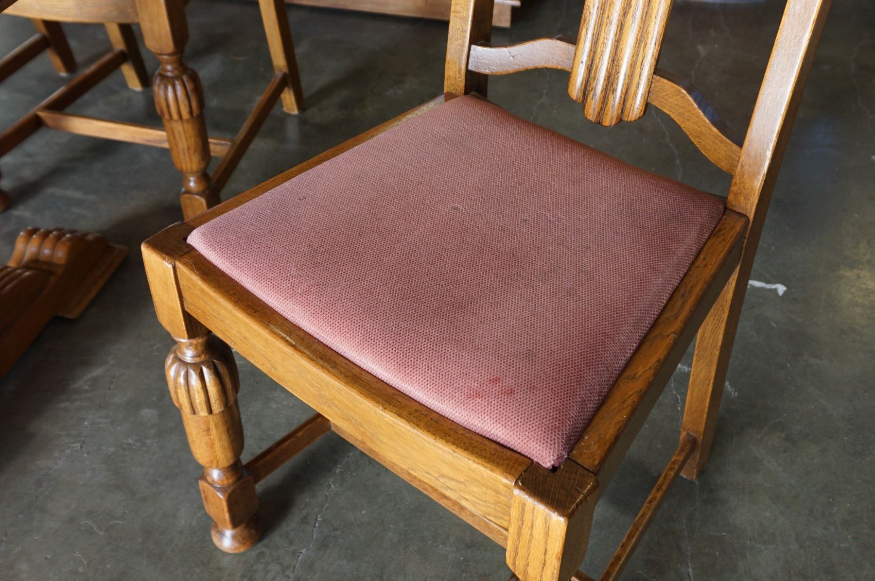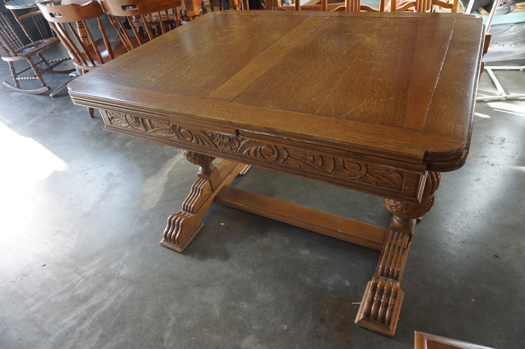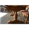 ANTIQUE ENGLISH OAK CARVED DINING TABLE DRAWLEAF WITH 4 CHAIRS