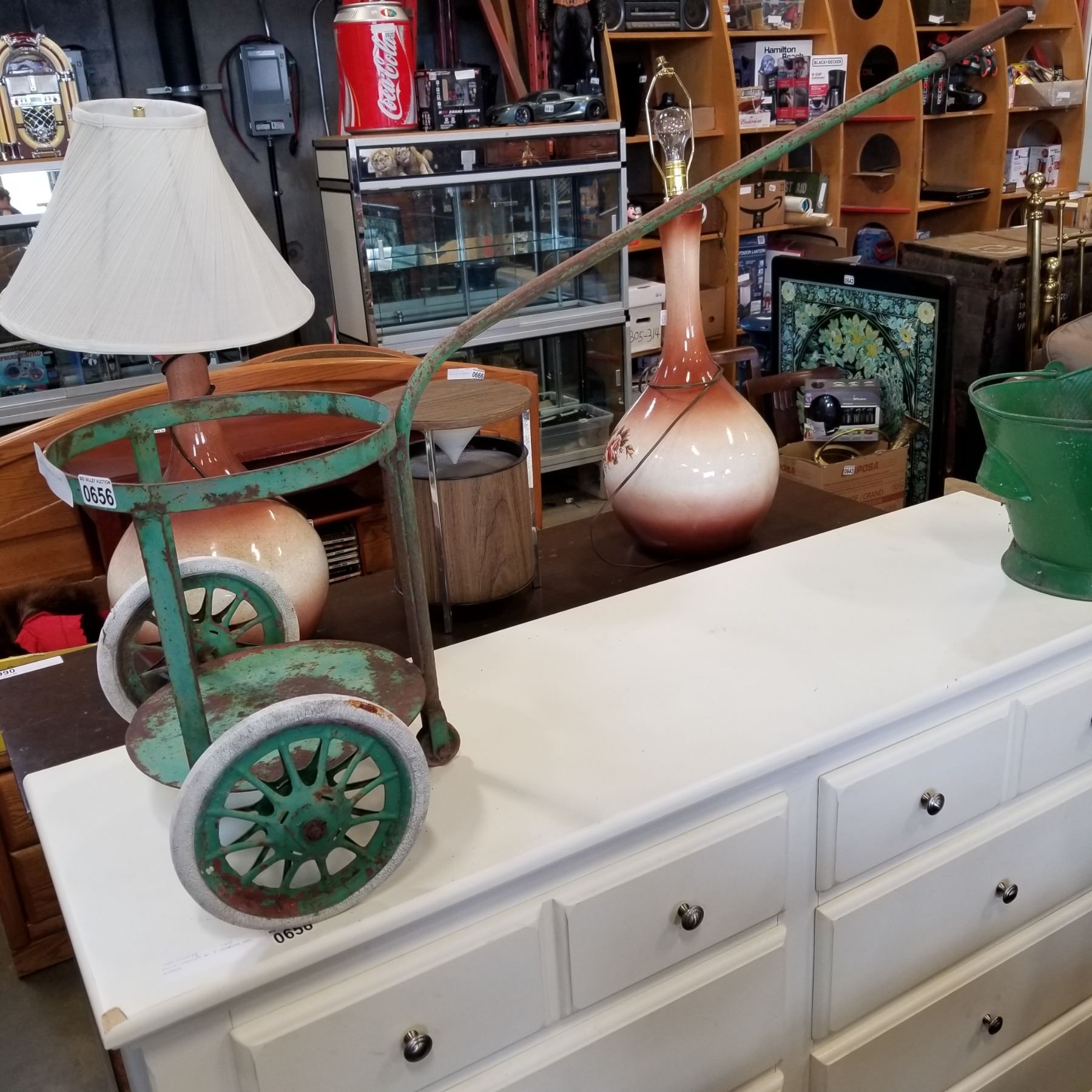ANTIQUE GREEN 2 WHEELED PLANT STAND