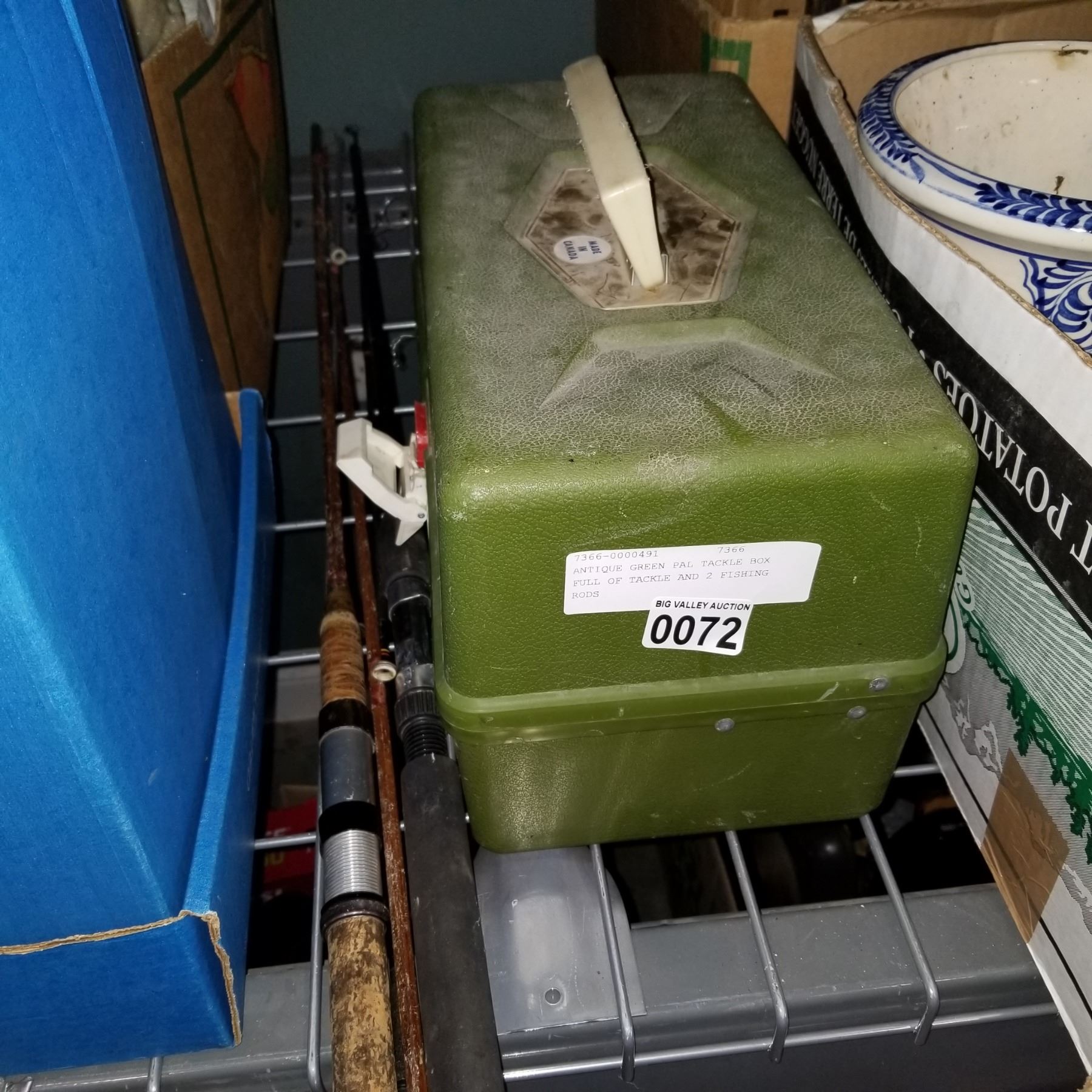 ANTIQUE GREEN PAL TACKLE BOX FULL OF TACKLE AND 2 FISHING RODS
