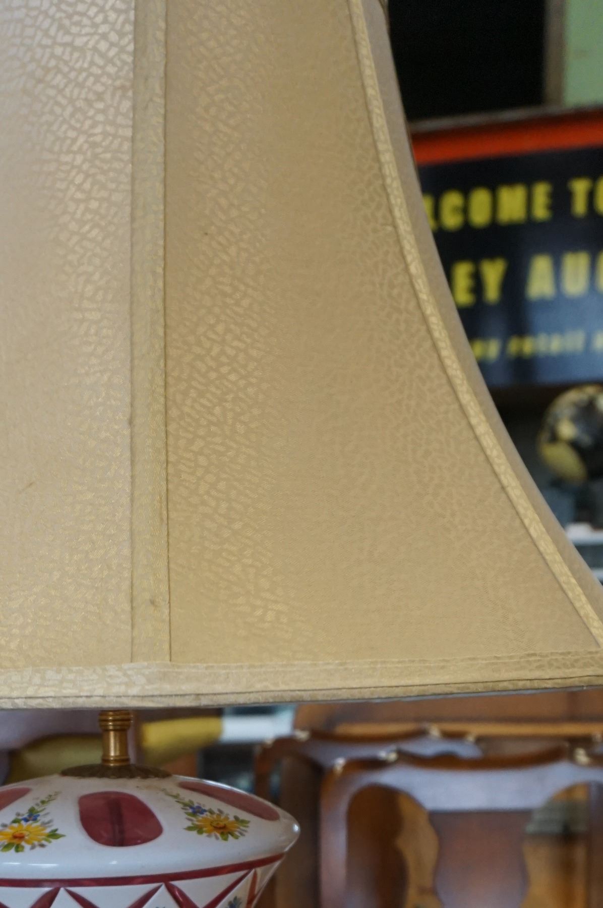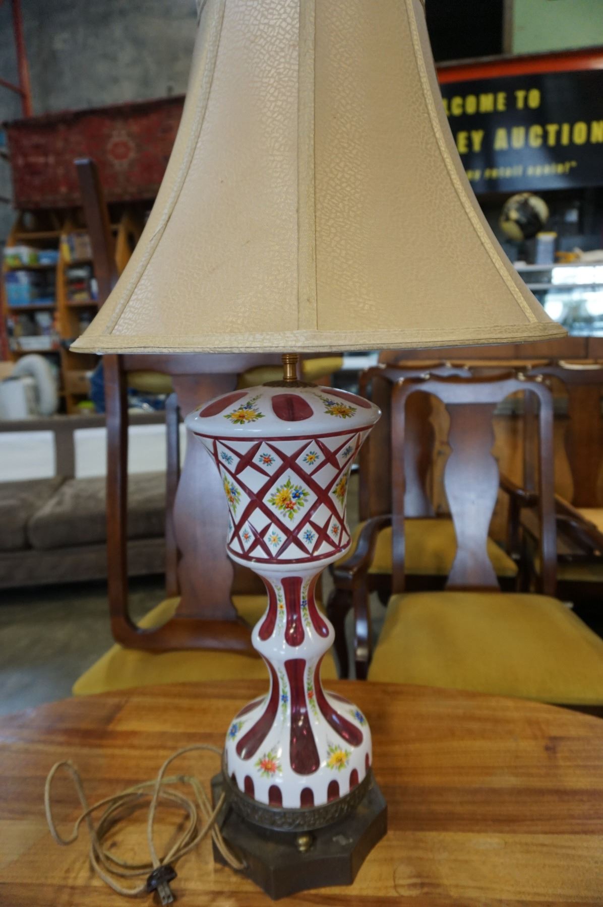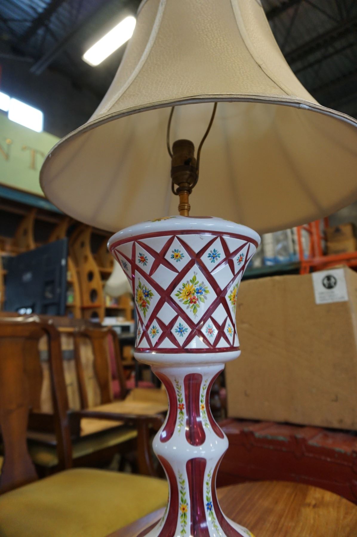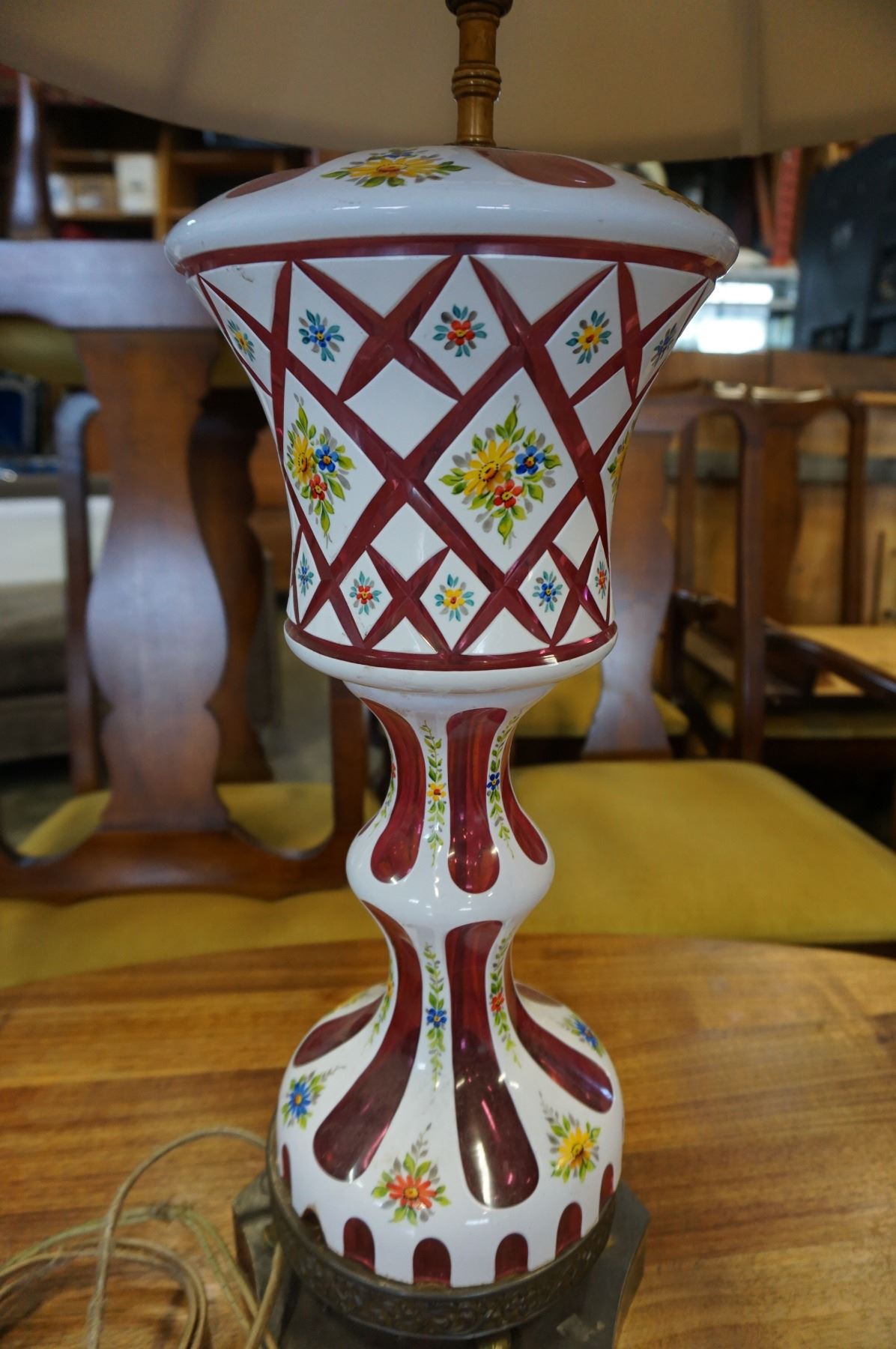ANTIQUE HAND PAINTED LAMP W/ CRANBERRY GLASS INSERTS W/ SHADE