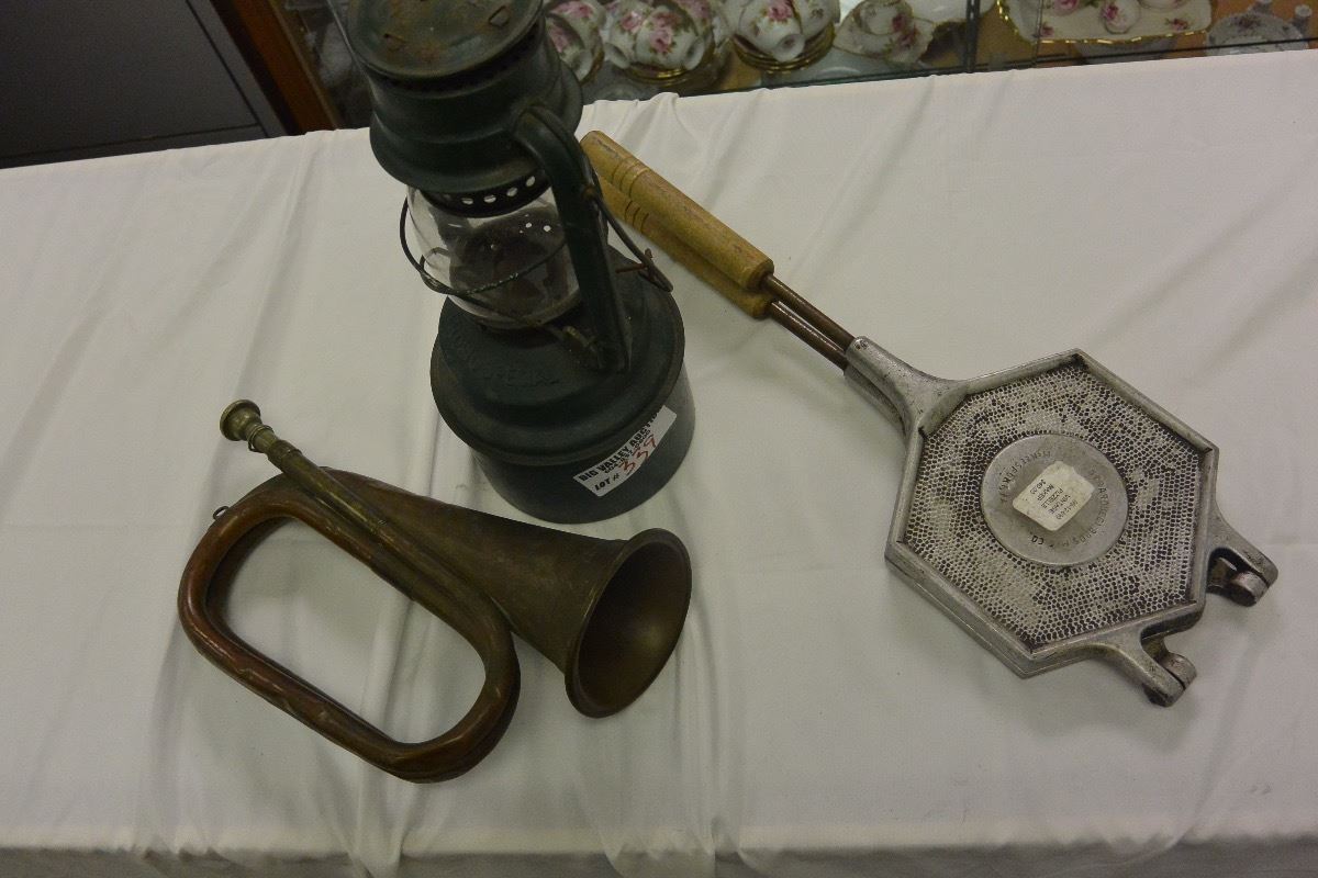 ANTIQUE LANTERN, FOOD COOKER AND TRUMPET