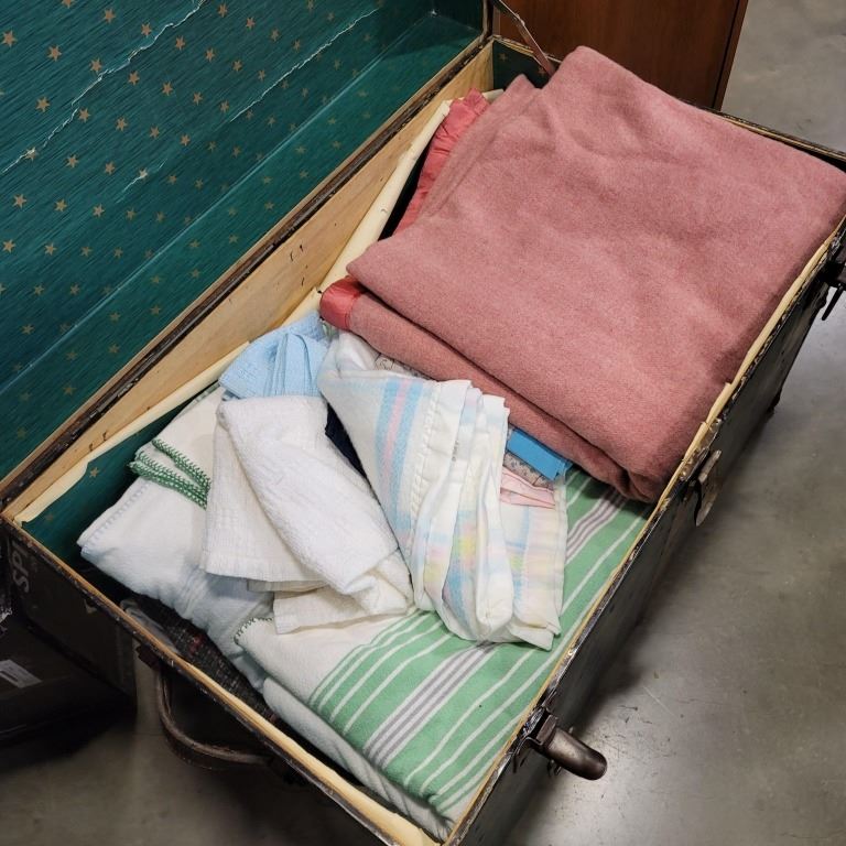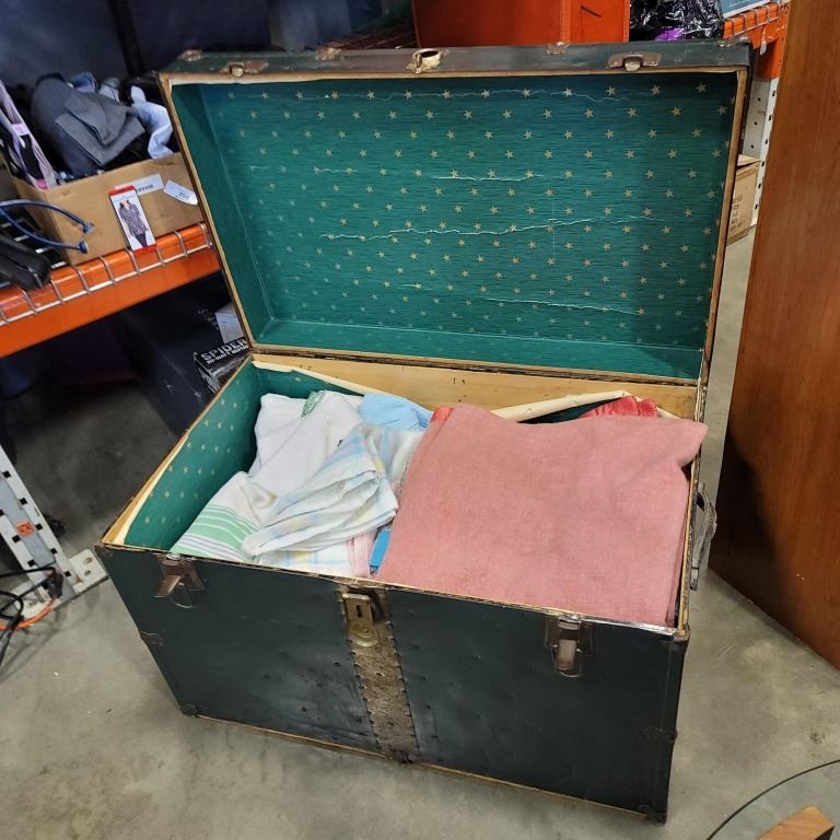 ANTIQUE METAL SHIPPING TRUNK FULL OF VINTAGE BLANKETS