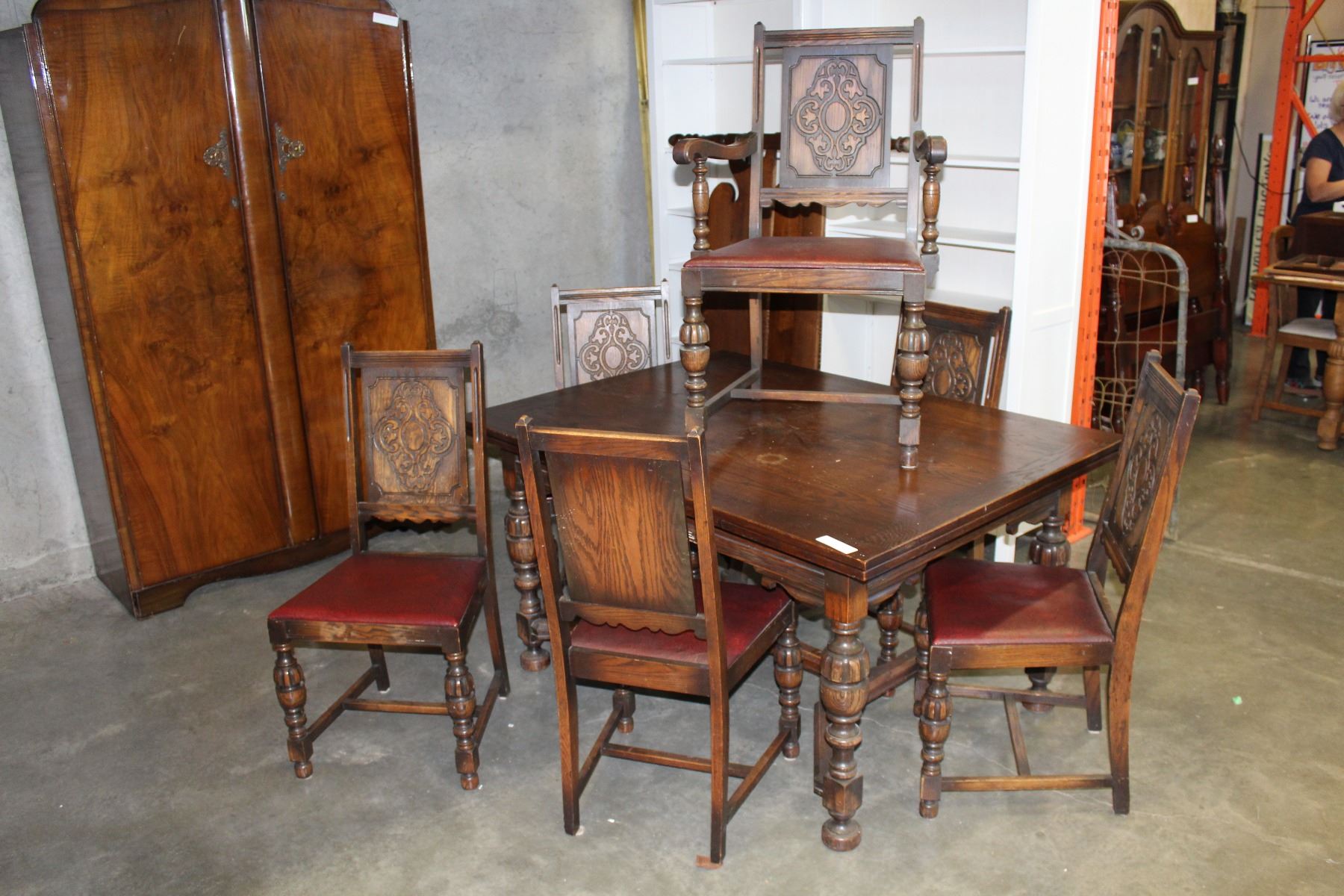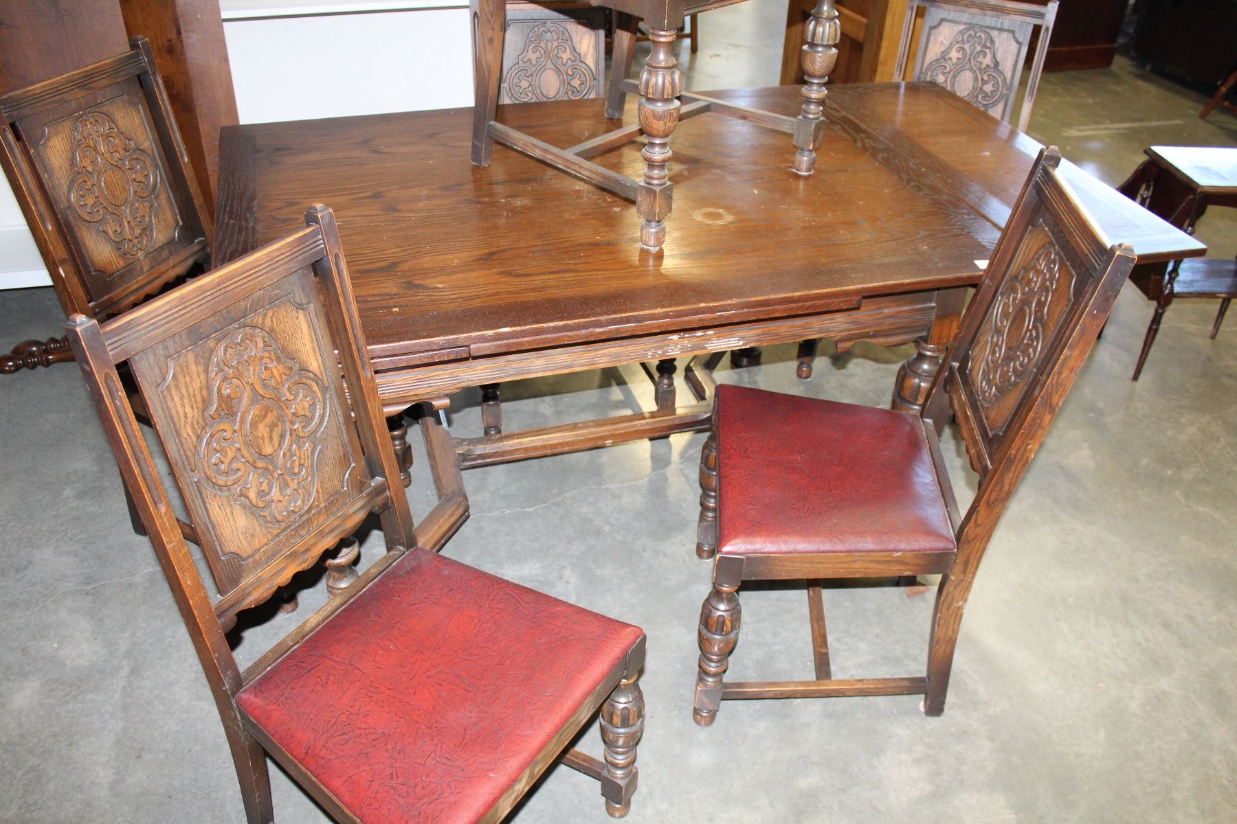 ANTIQUE OAK DRAWLEAF DINING TABLE AND SIX CHAIRS BY STRATHROY FURNITURE