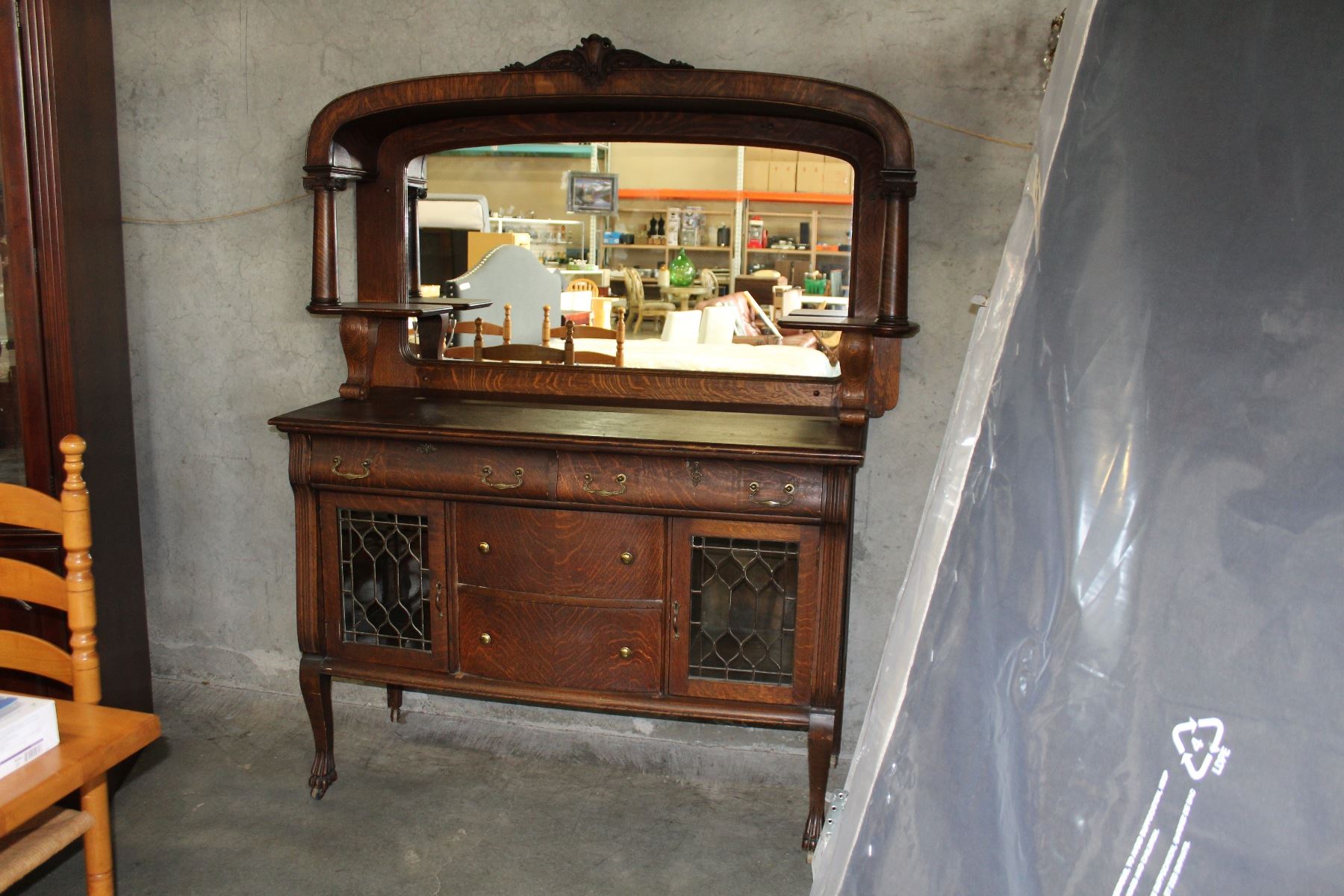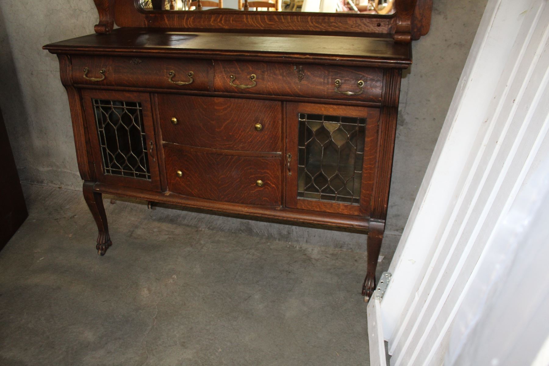 ANTIQUE OAK PAWFOOT DISPLAY CABINET W/ LEADED GLASS DOORS