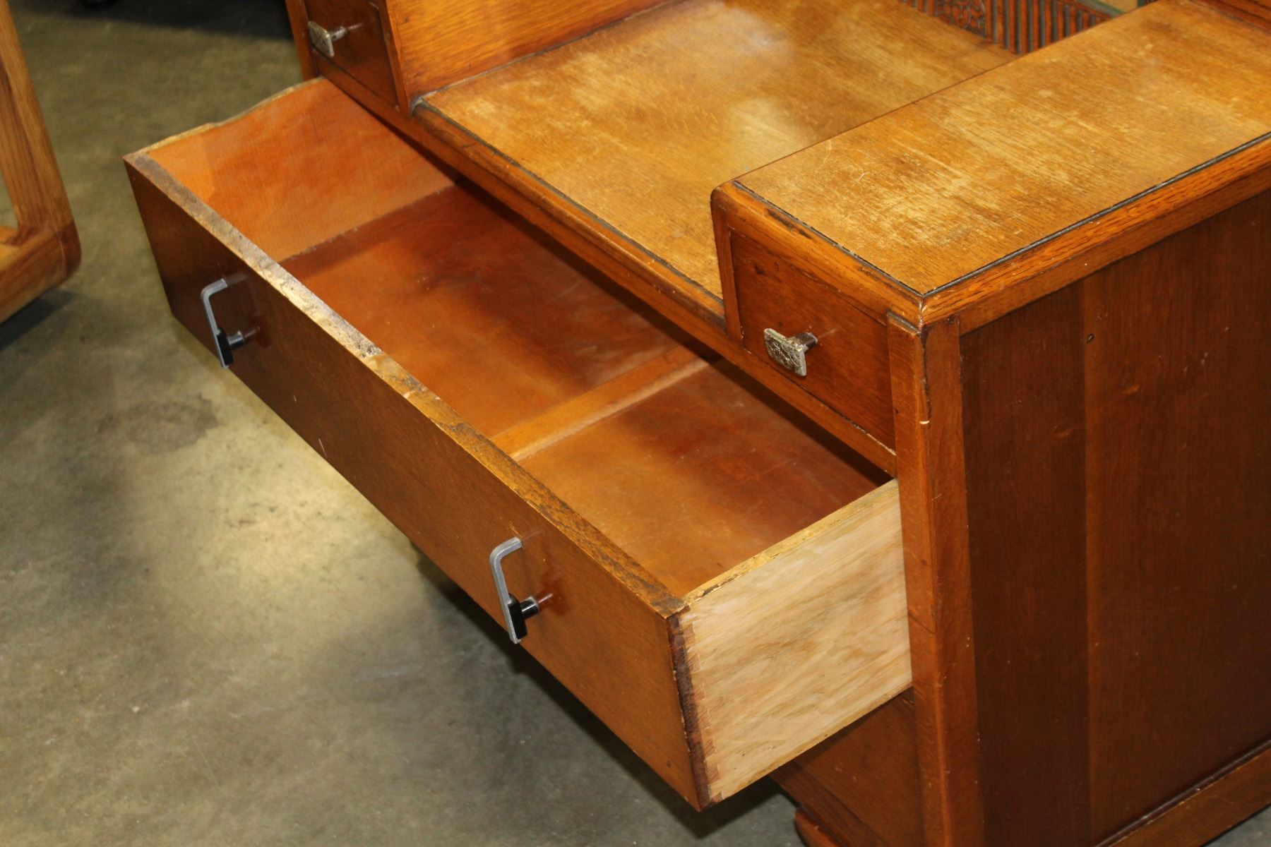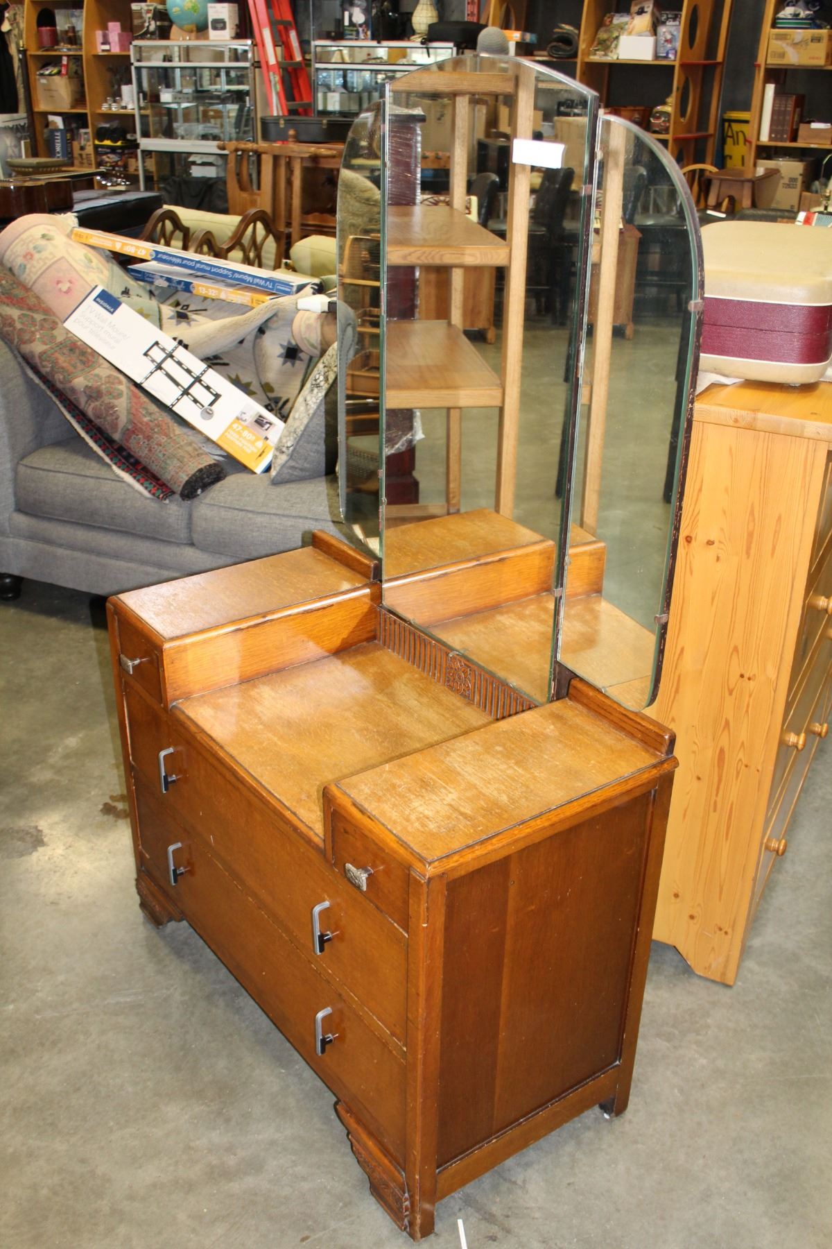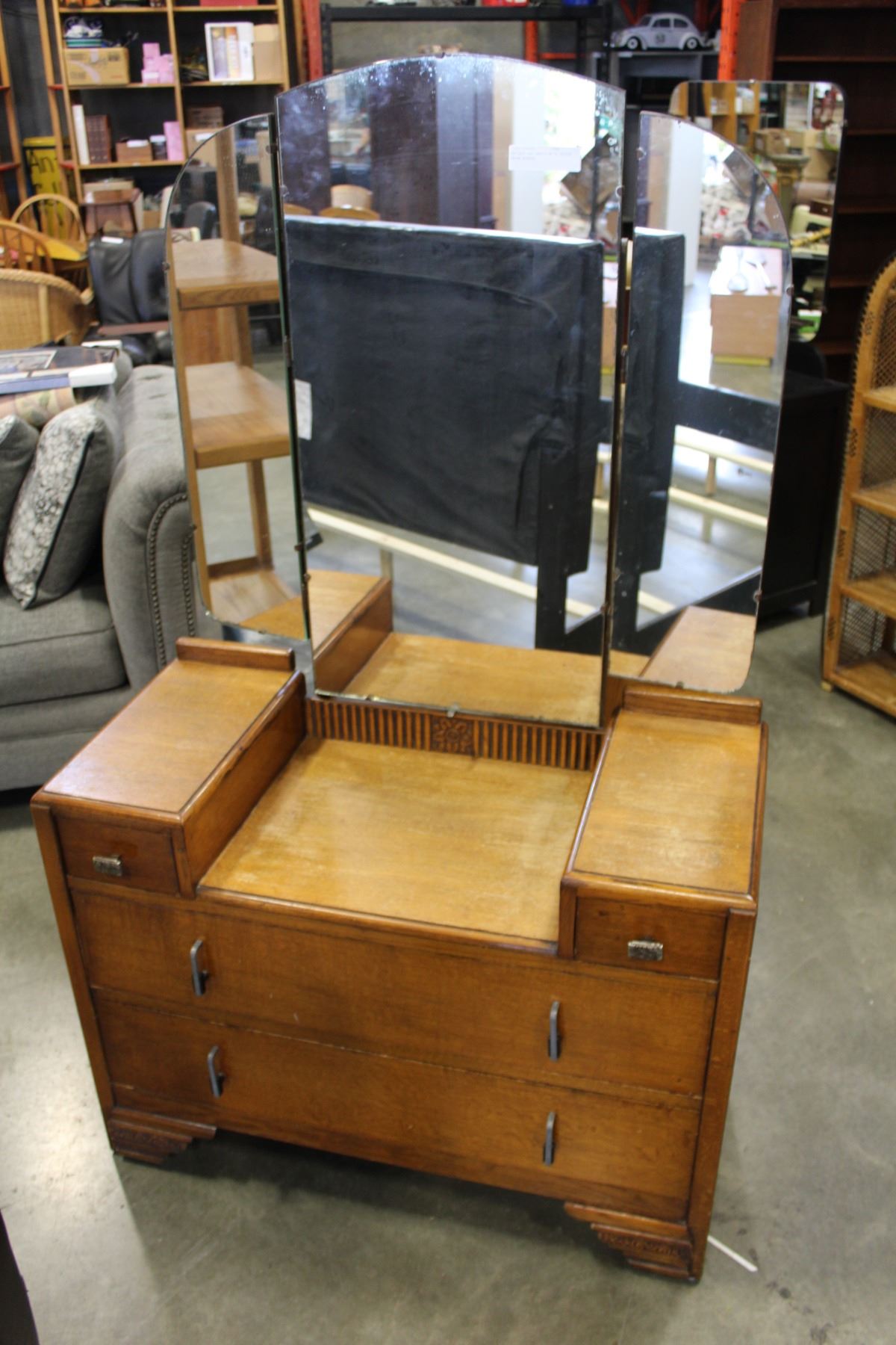 ANTIQUE OAK VANITY WITH TRIPLE SWING MIRROR