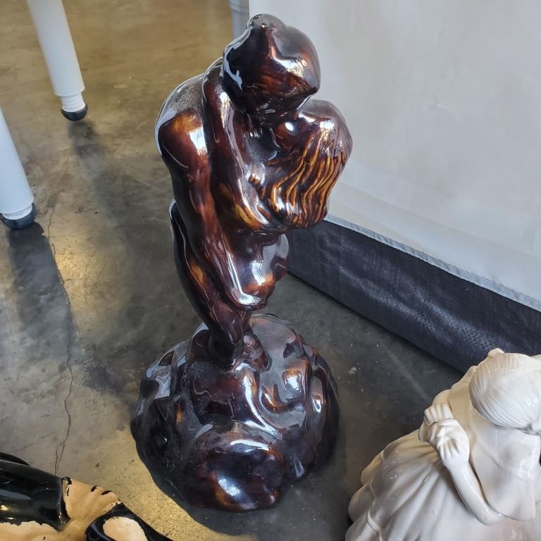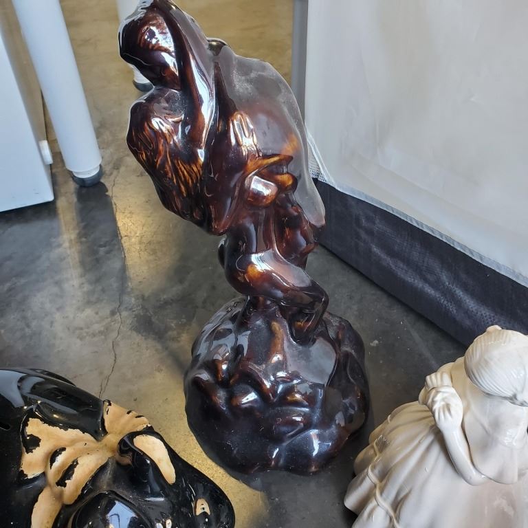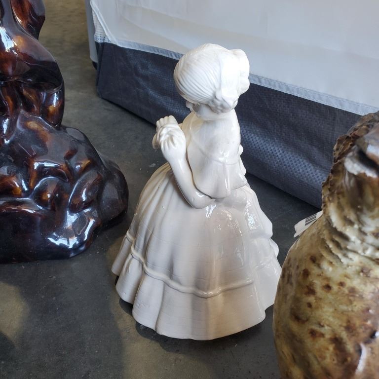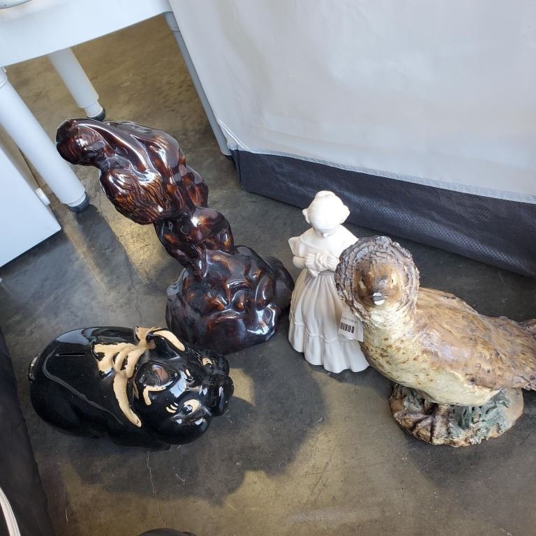 ANTIQUE PIGGY BANK, BIRD FIGURE AND 2 POTTERY FIGURINES