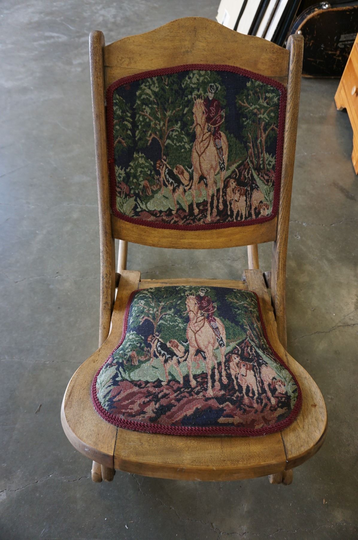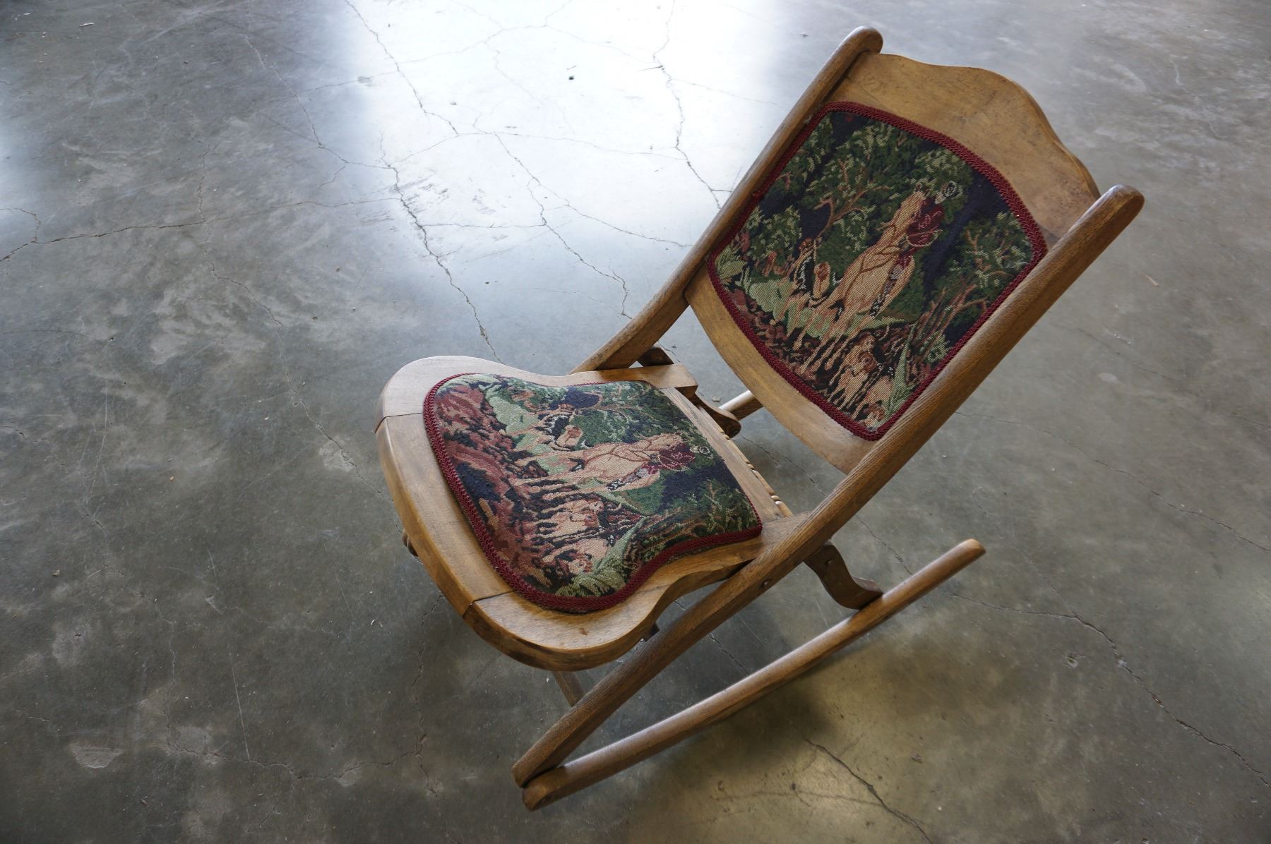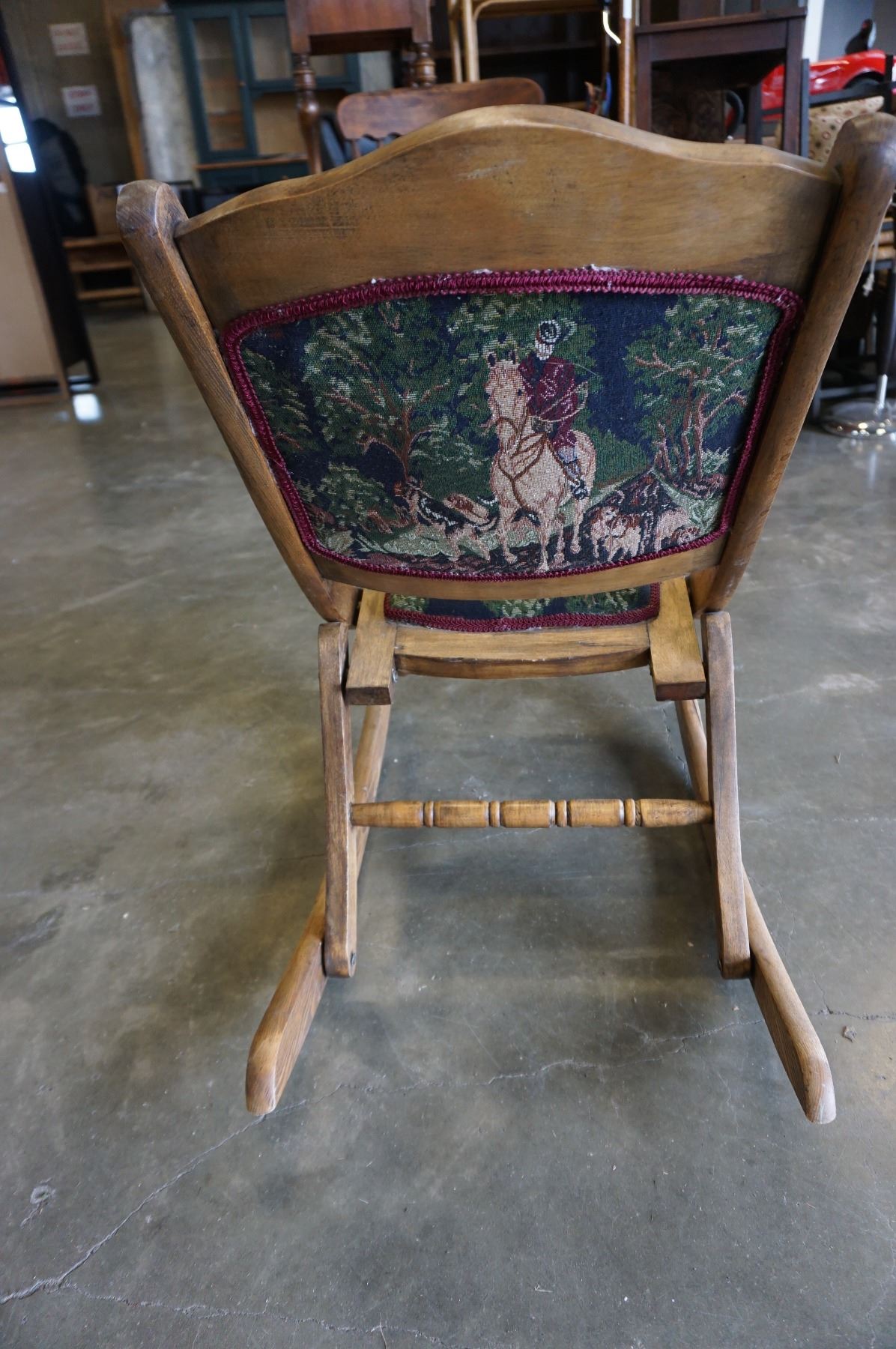 ANTIQUE ROCKING CHAIR W/ HORSE AND DOGS MOTIF CUSHION