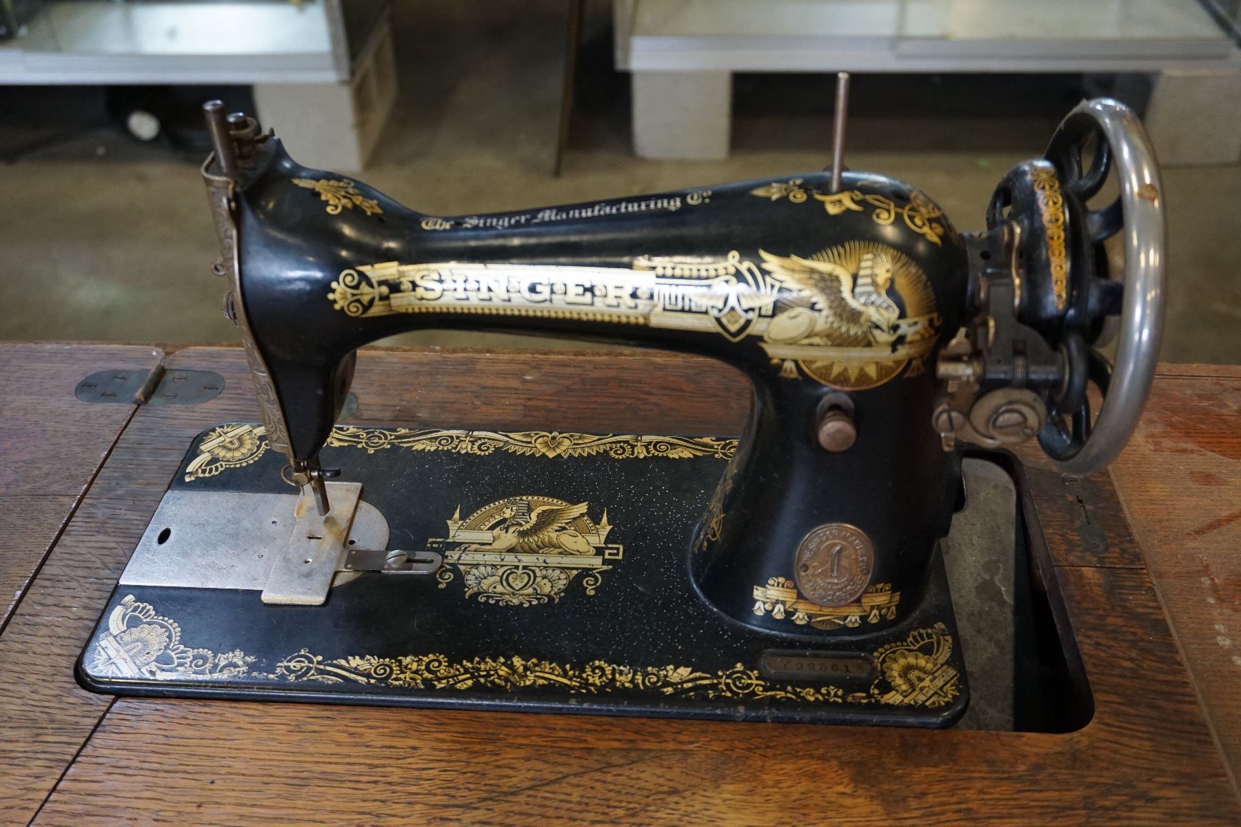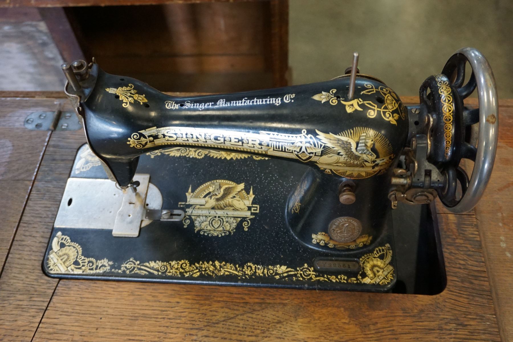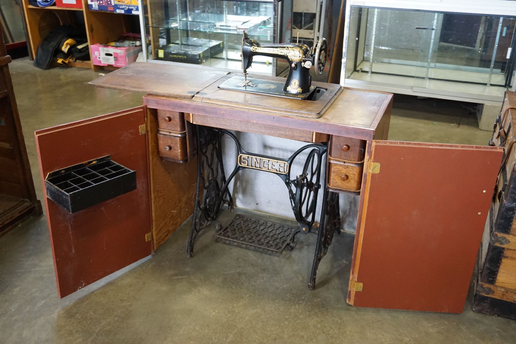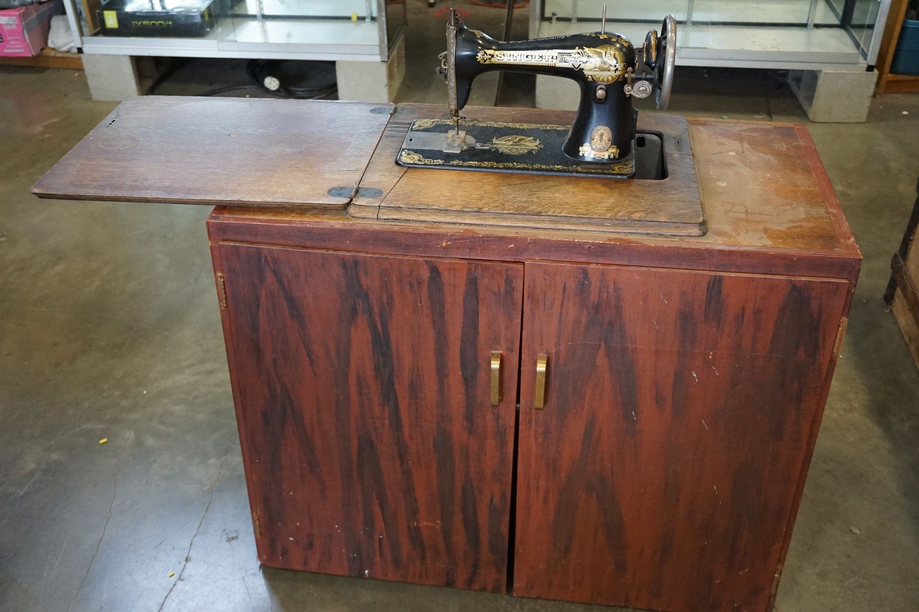 ANTIQUE SINGER SEWING MACHINE IN WOOD CABINET
