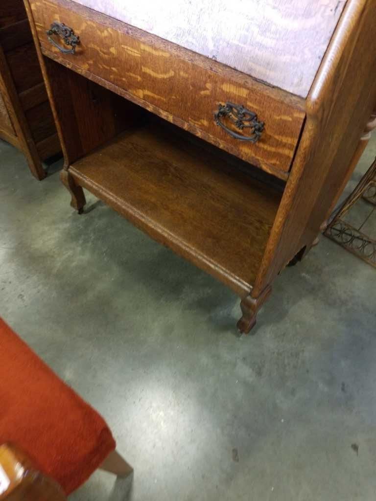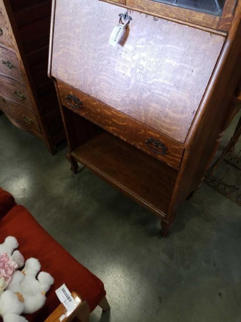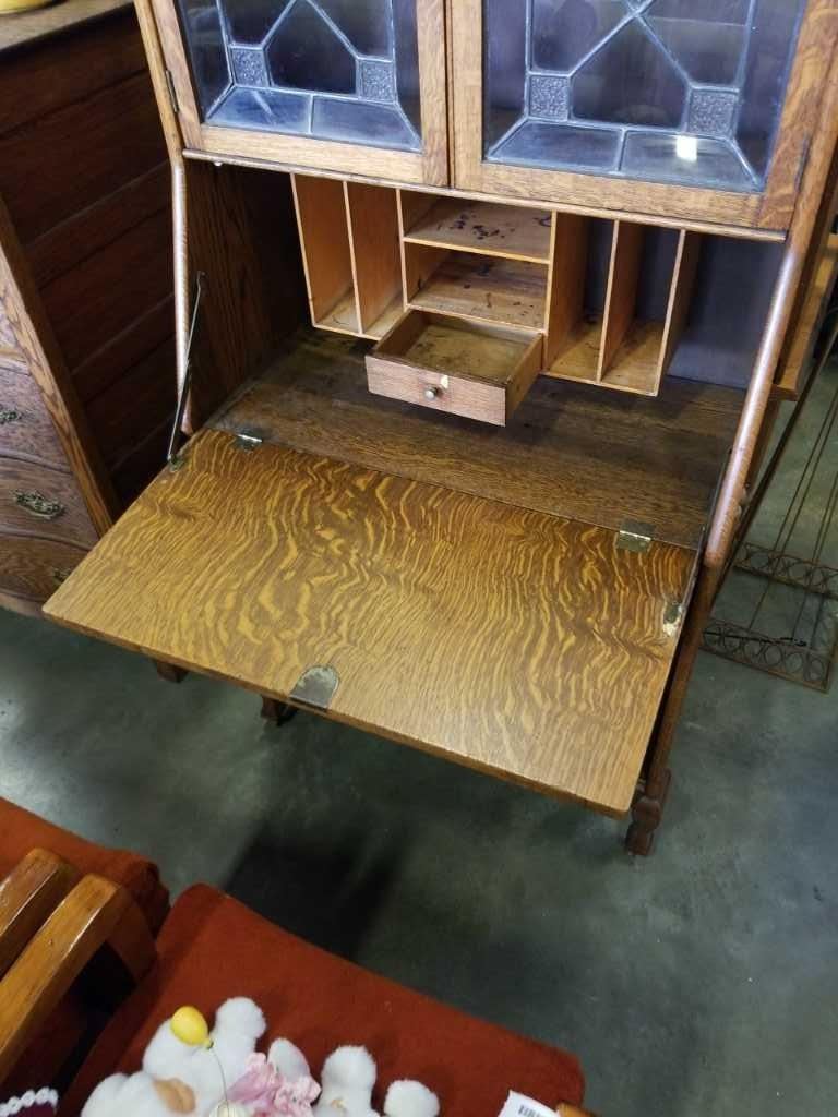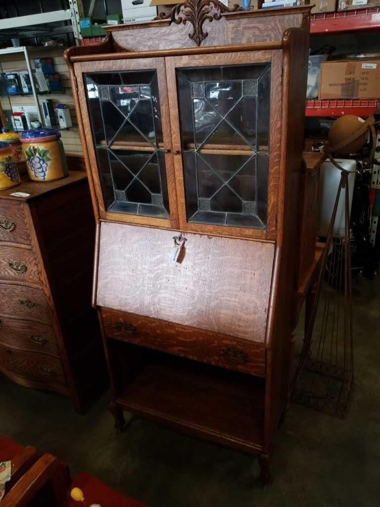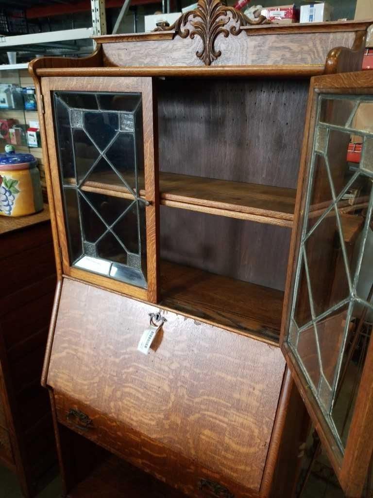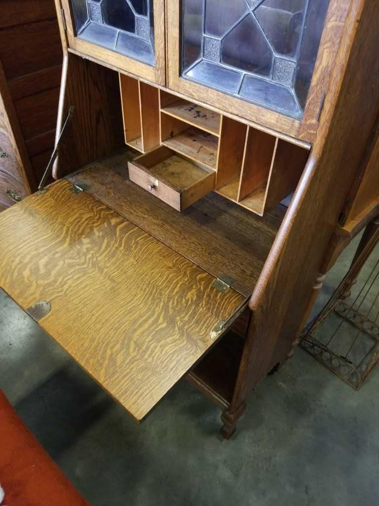 ANTIQUE SOLID OAK SECRETAIR DESK WITH LEADED GLASS WINDOWS