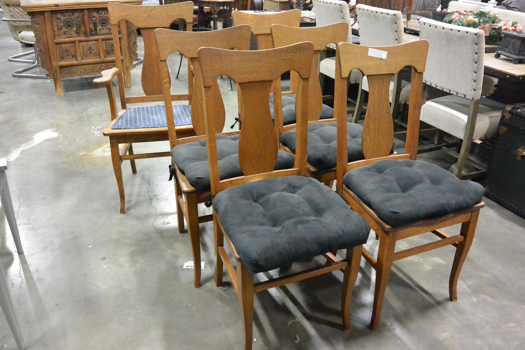 ANTIQUE TIGER OAK DINING TABLE WITH FOUR LEAFS AND SIX T-BACK CHAIRS
