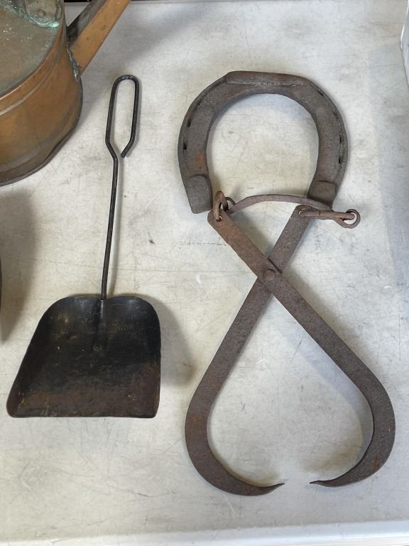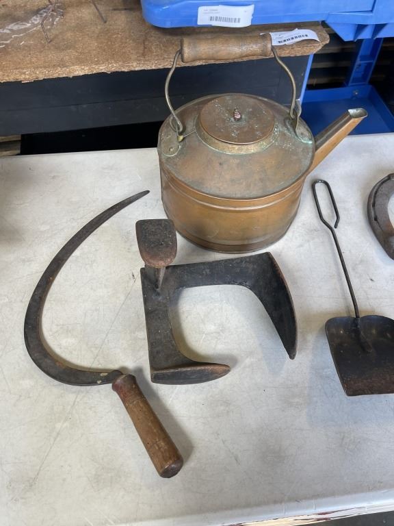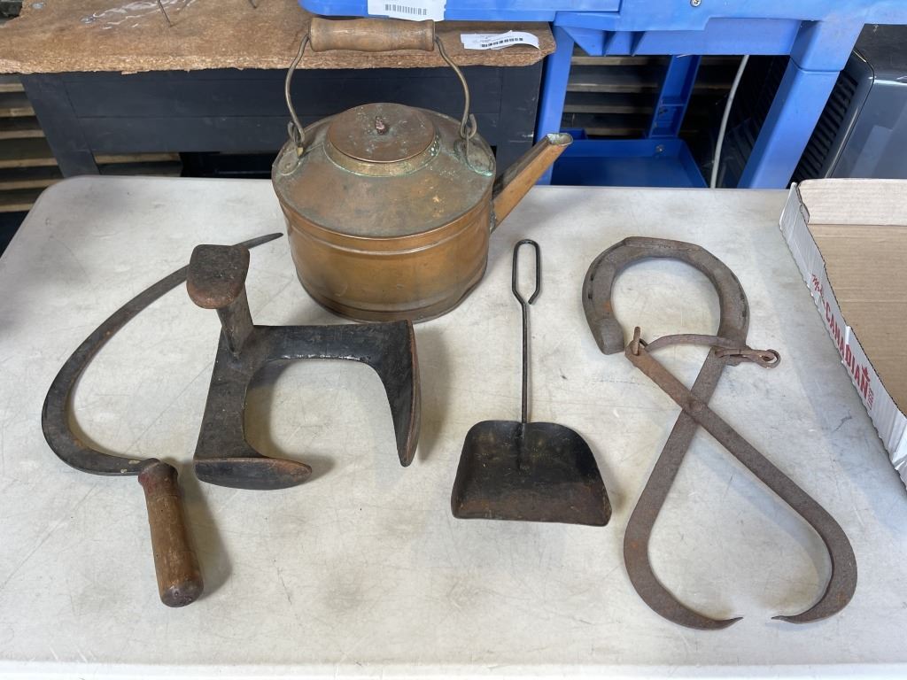 ANTIQUE TOOLS, HORESHOE, SICKLE ETC