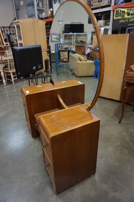 ANTIQUE VANITY WITH MIRROR - MIRROR APPROX 46 INCHES ACROSS