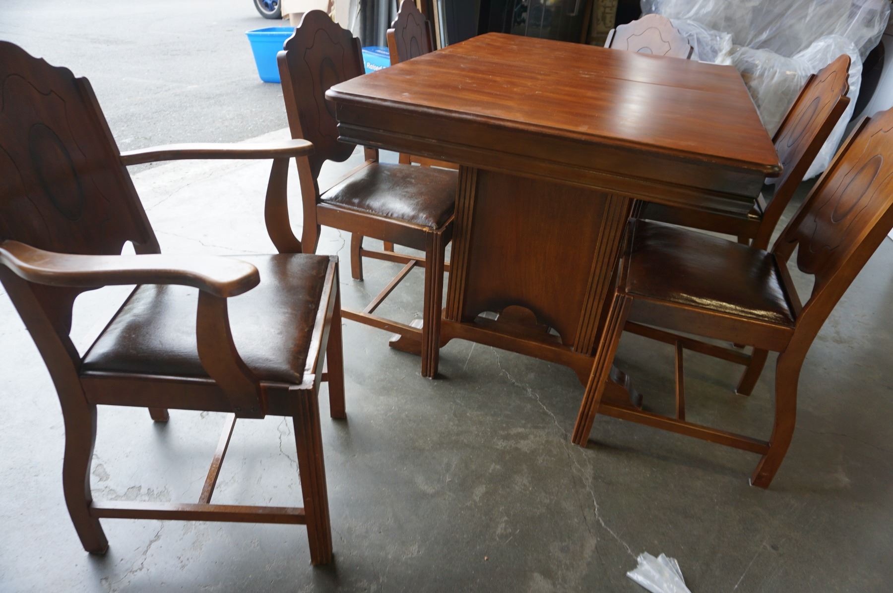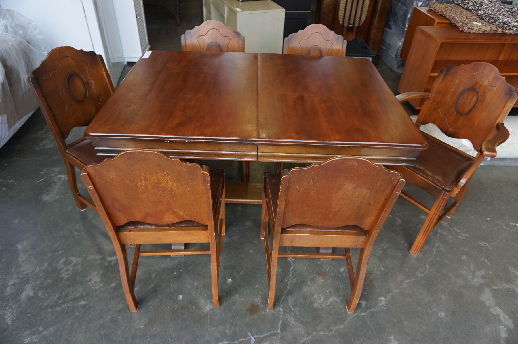 ANTIQUE WALNUT DINING TABLE AND 6 LEATHER SEAT CHAIRS