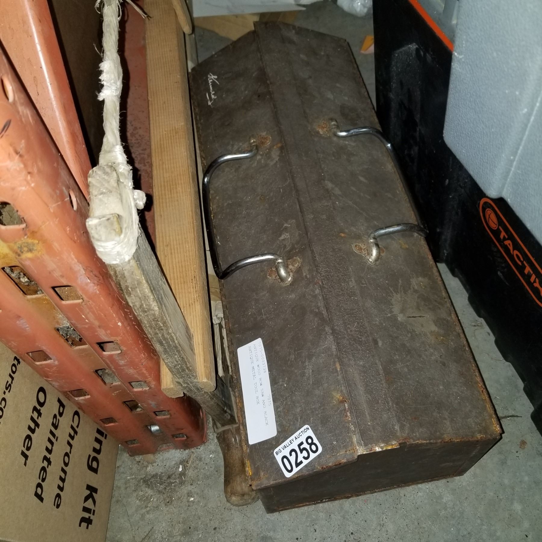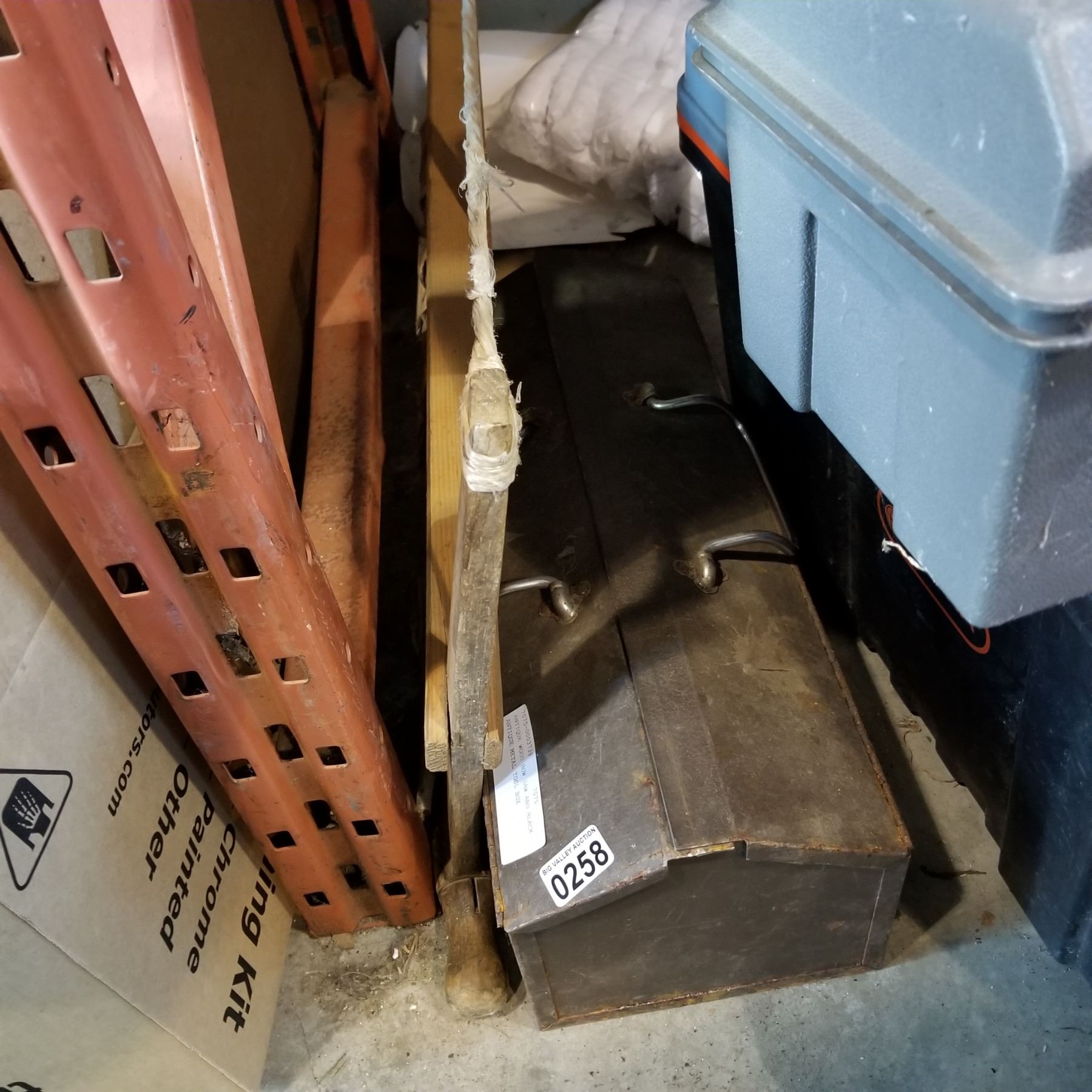 ANTIQUE WOOD BOW SAW AND BLACK ANTIQUE METAL TOOL BOX