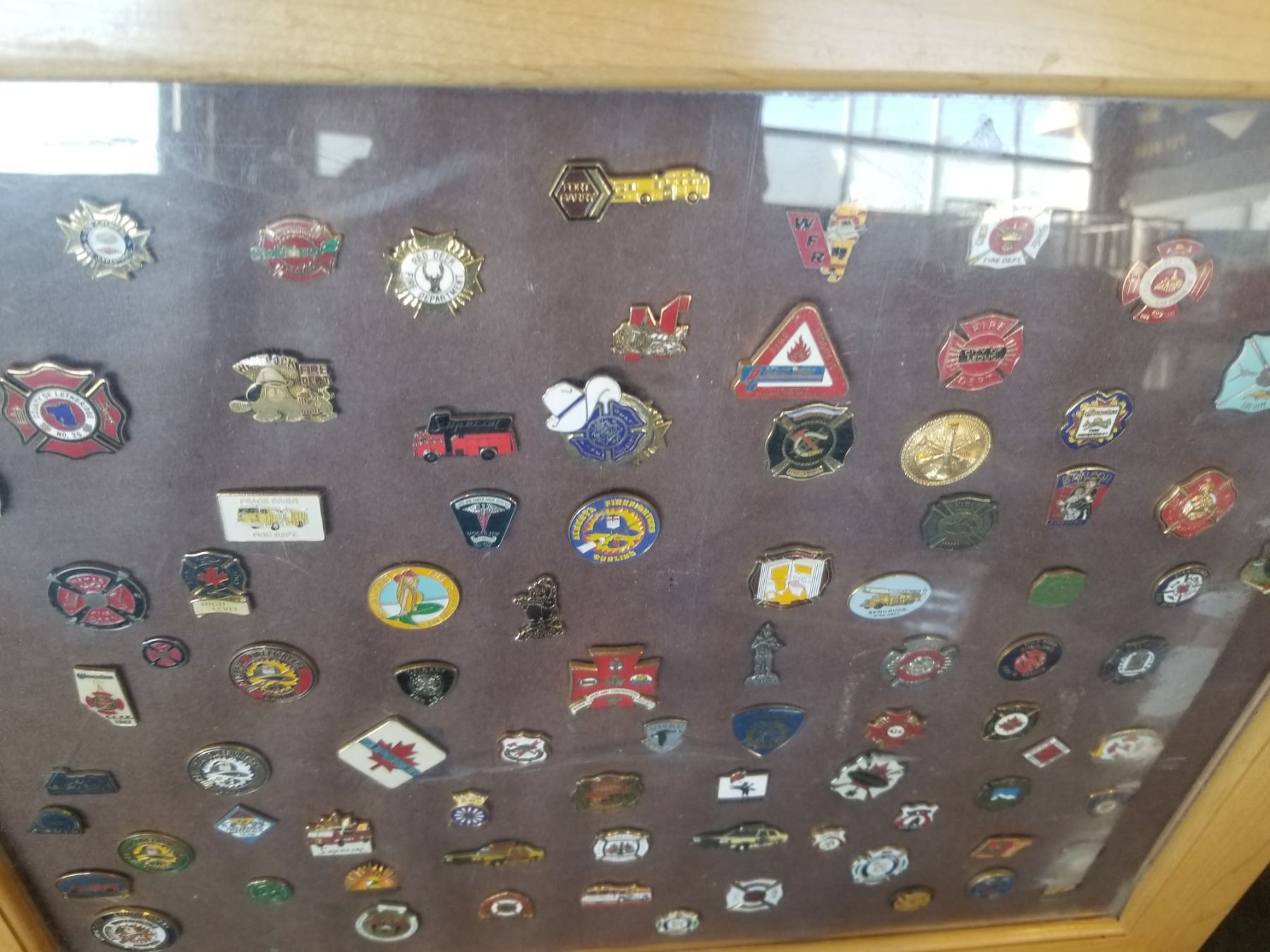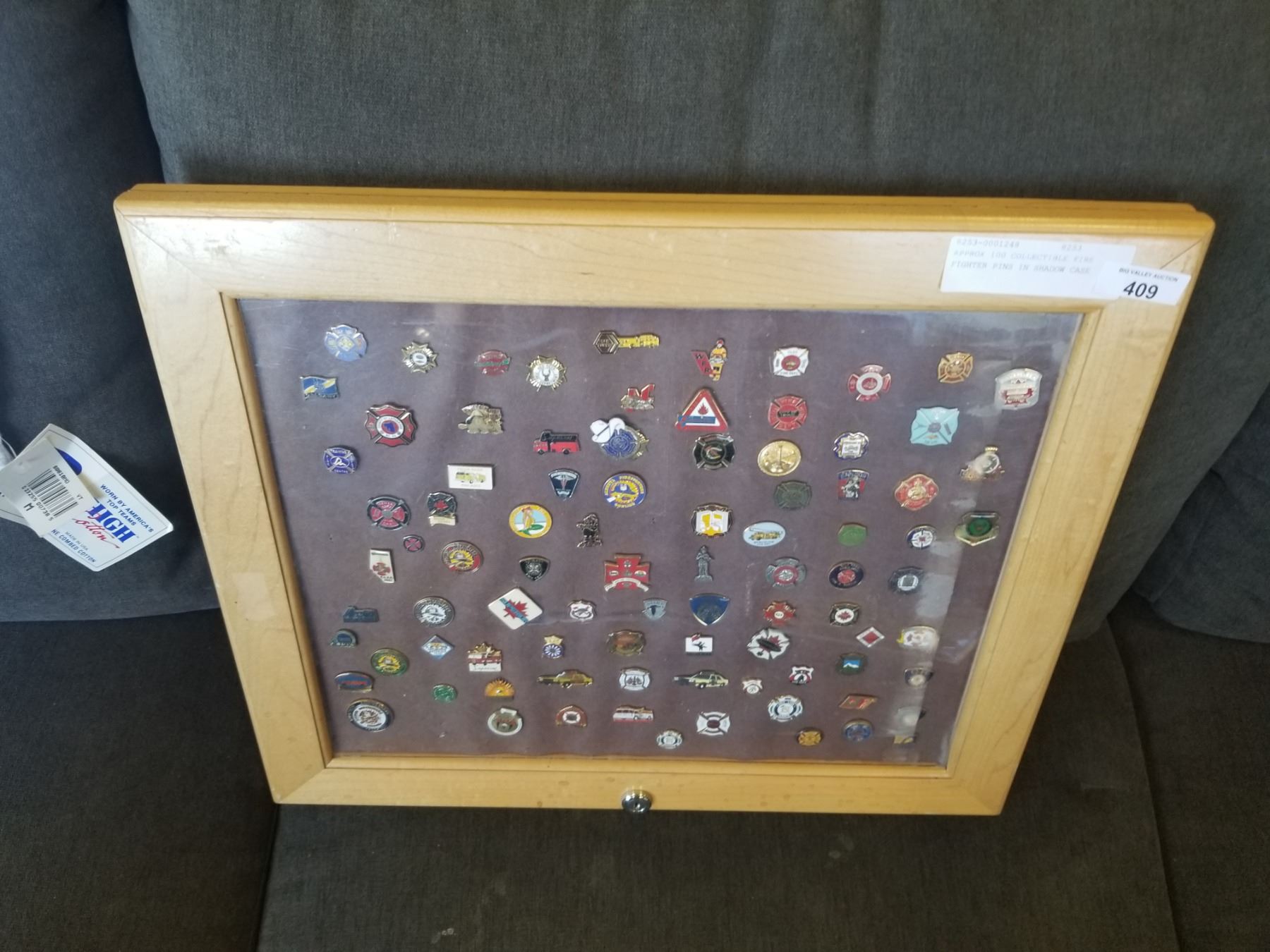 APPROX 100 COLLECTIBLE FIRE FIGHTER PINS IN SHADOW CASE