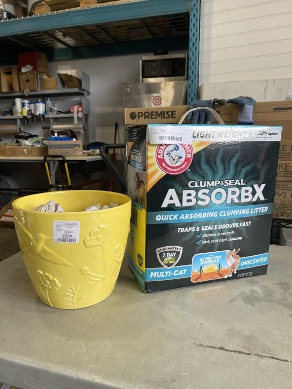 ARM AND HAMMER 15LB CLUMP AND SEAL LITTER, AND YELLOW PLANT POT