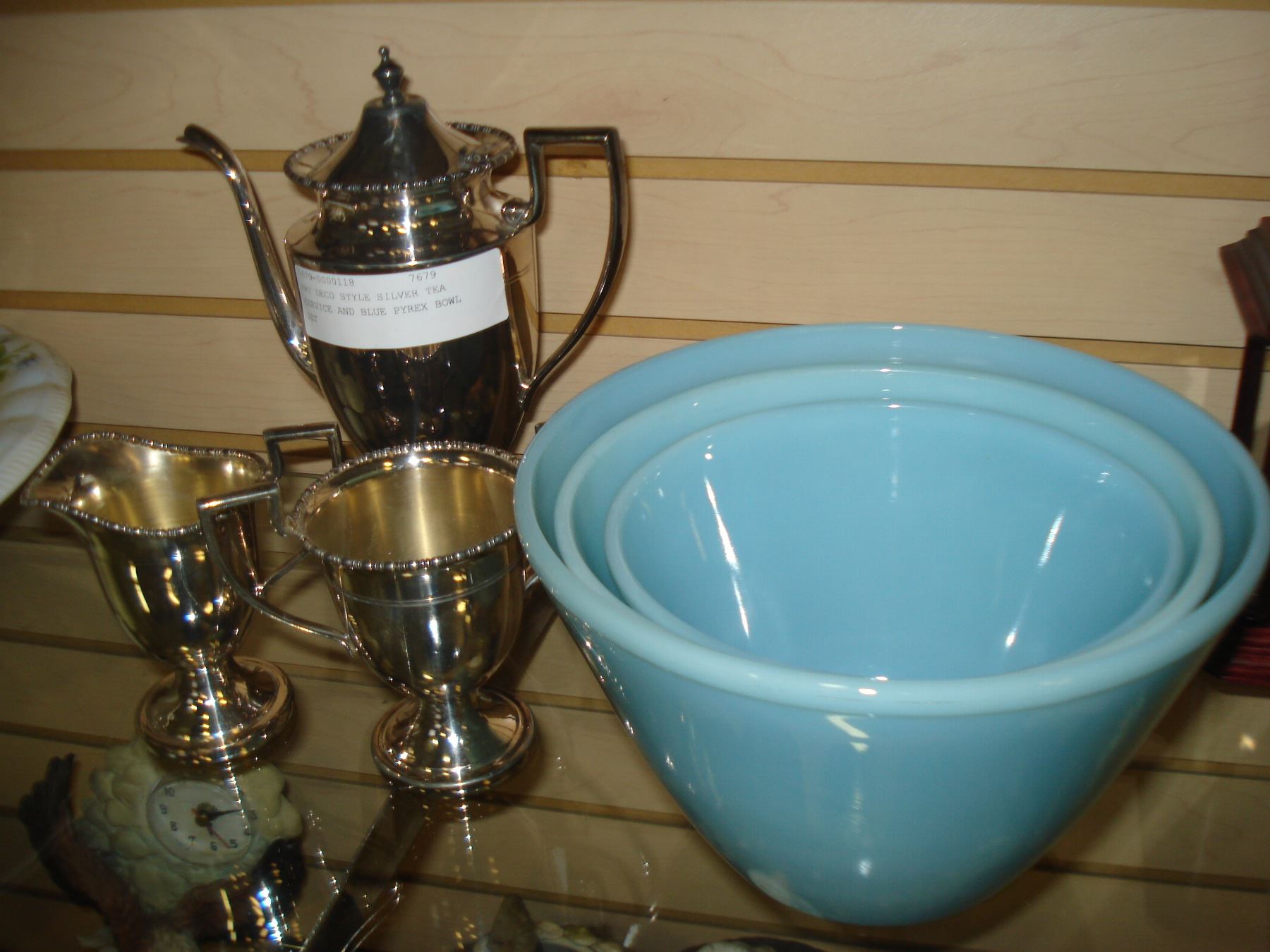 ART DECO STYLE SILVER TEA SERVICE AND BLUE PYREX BOWL SET