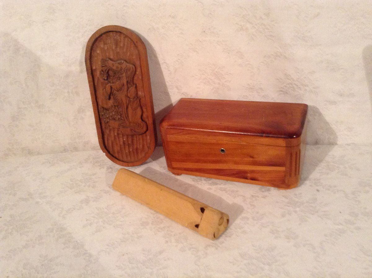 ART DECO WDN BOX, CRVD WDN PLAQUE, + FOLK ART TRAIN