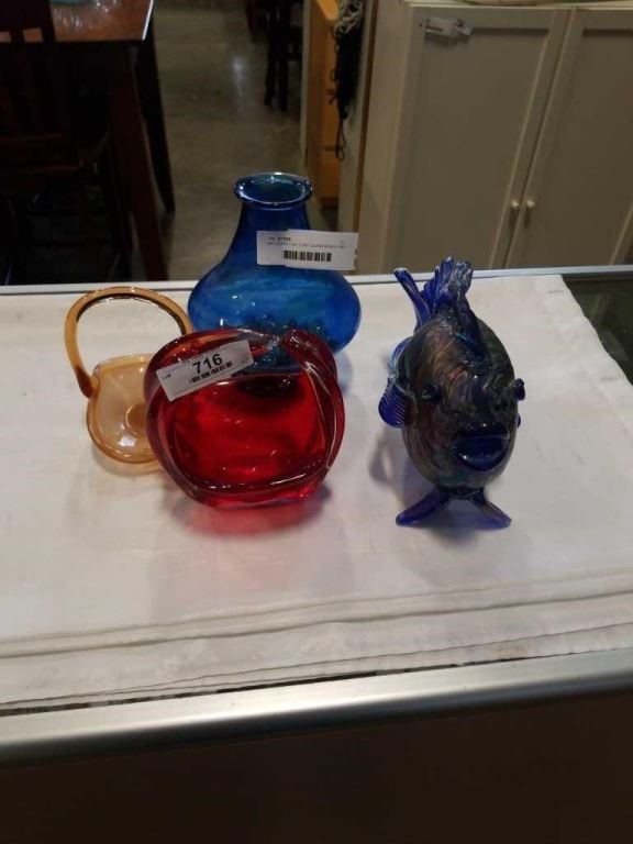 ART GLASS FISH, 2 ART GLASS BOWLS, AND VASE