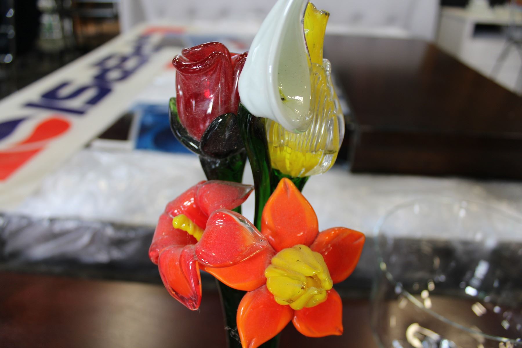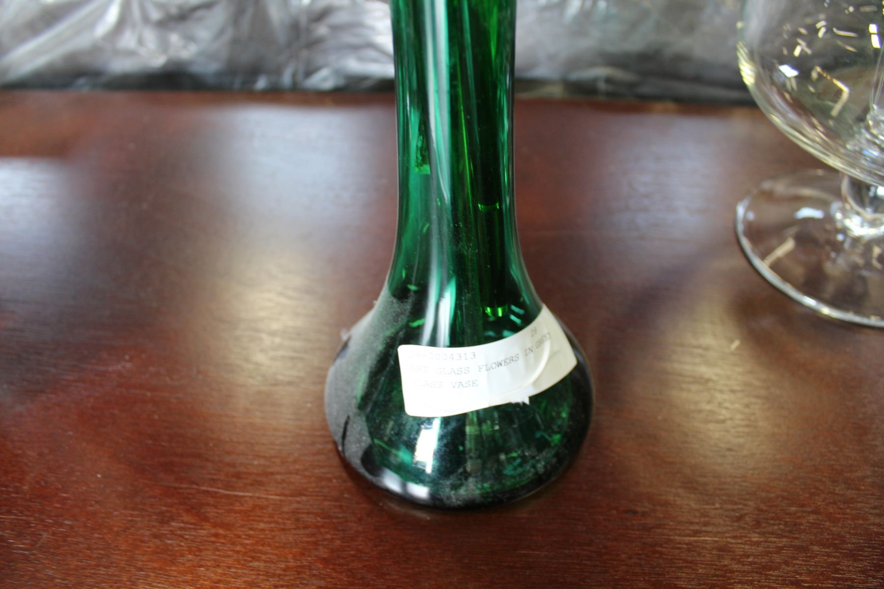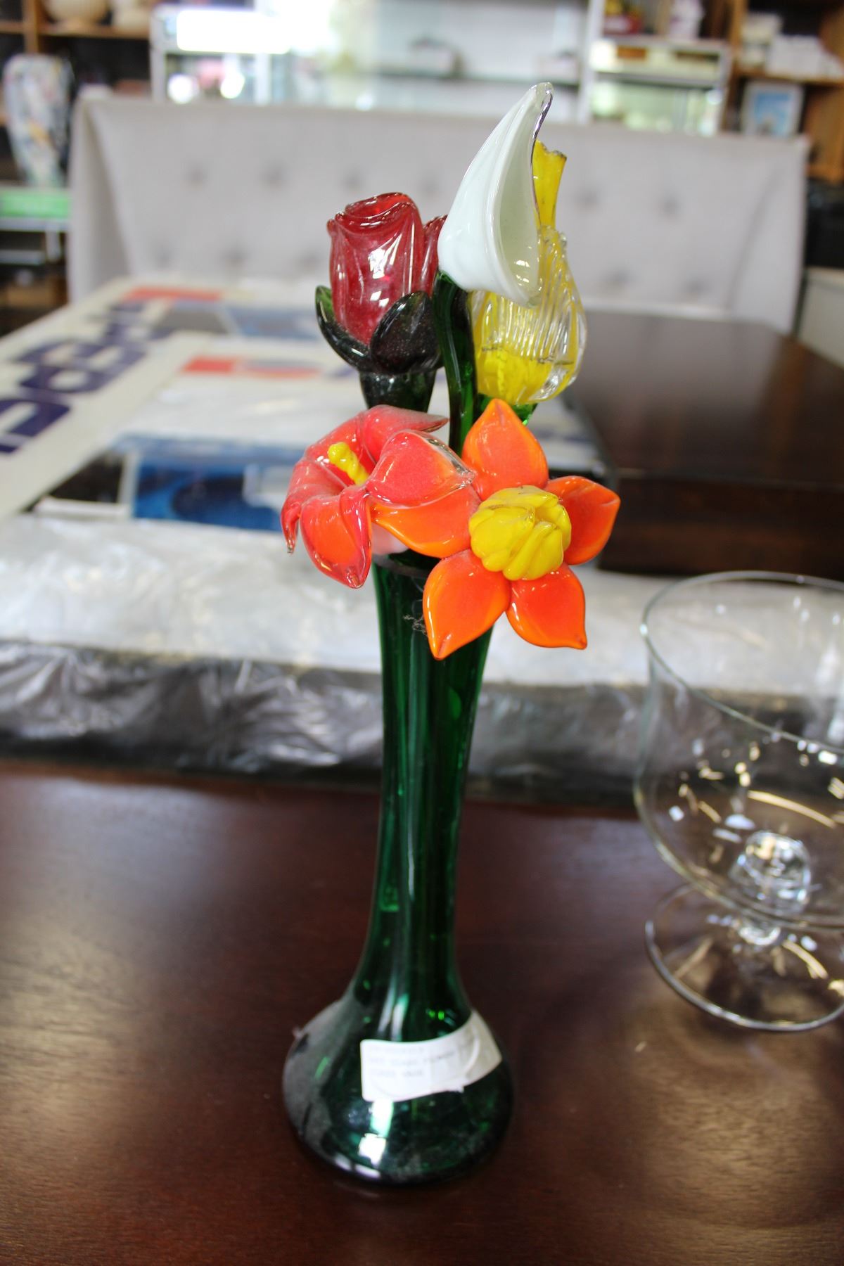ART GLASS FLOWERS IN GREEN GLASS VASE