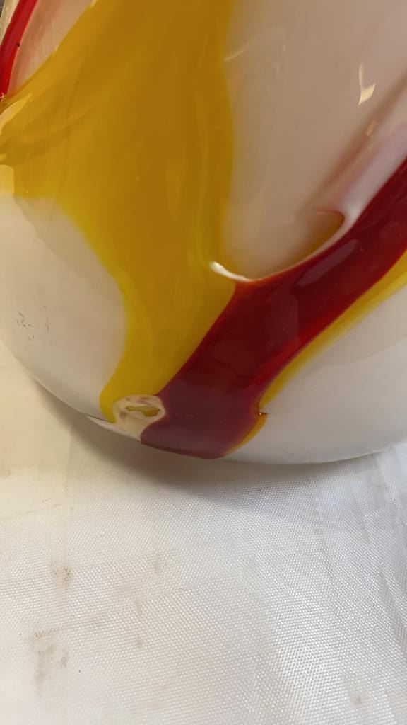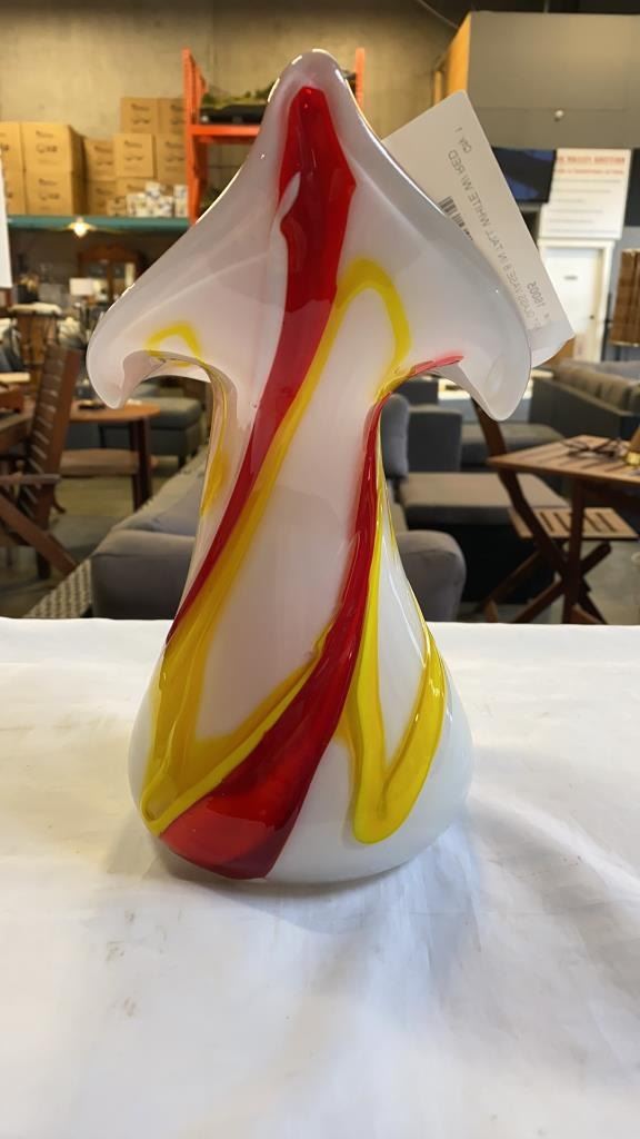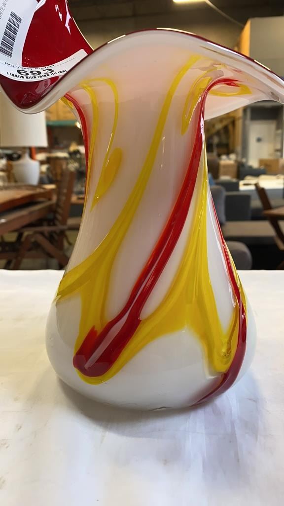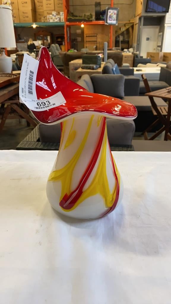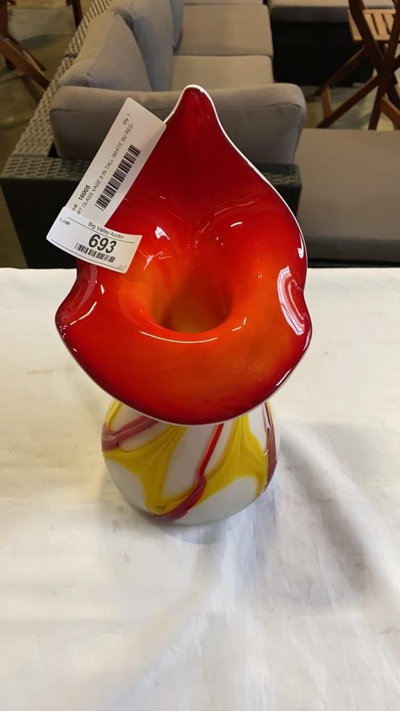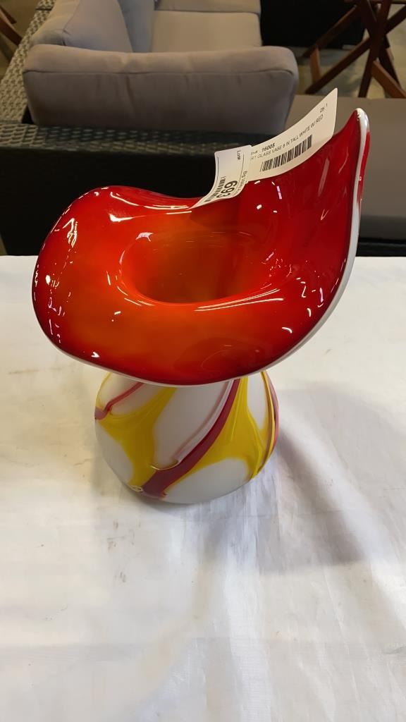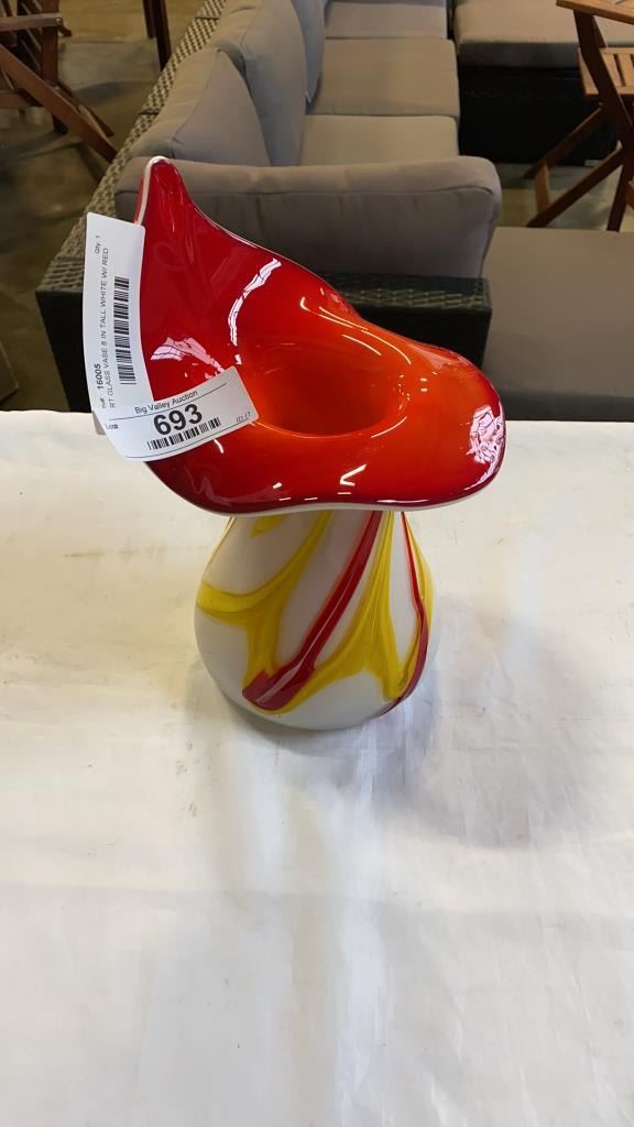 ART GLASS VASE 8 IN TALL WHITE W/ RED GLAZE