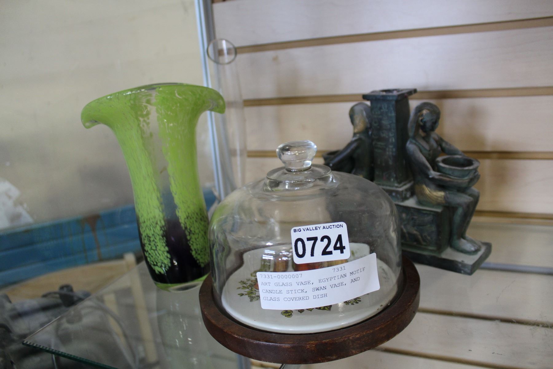 ART GLASS VASE, EGYPTIAN MOTIF CANDLE STICK, SWAN VASE, AND GLASS COVERED DISH
