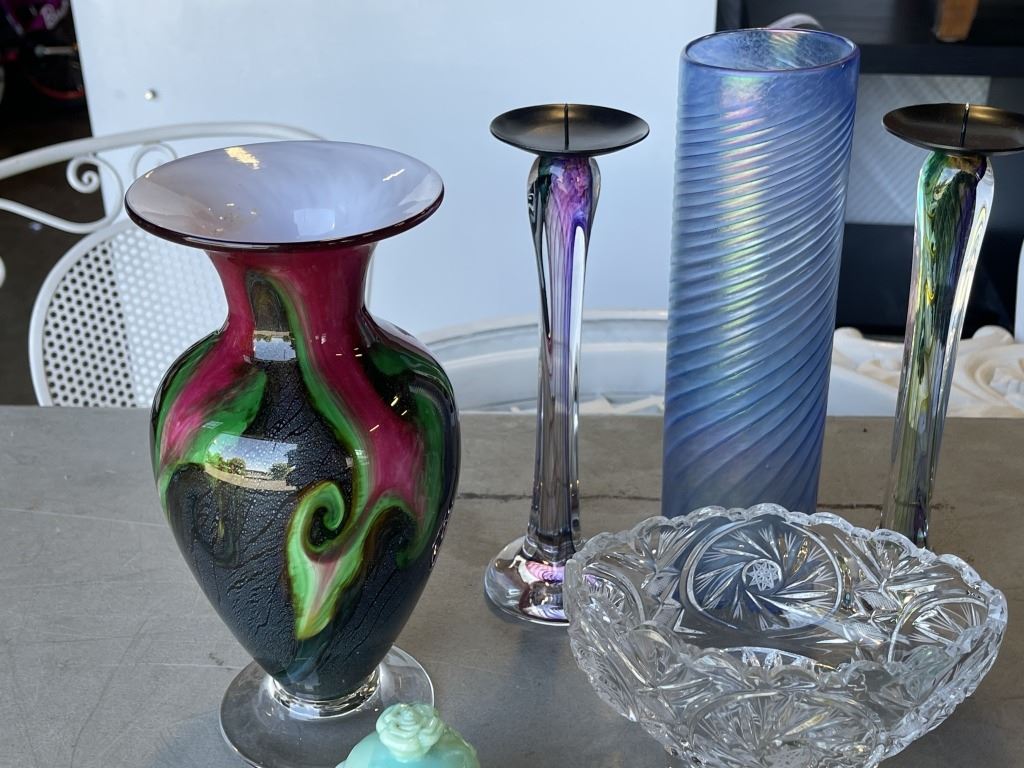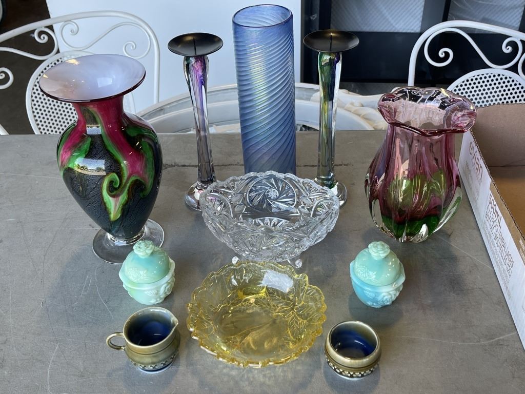 ART GLASS VASE, IRISH CREAM AND SUGAR SET, HAND PAINTED VASE AND ANTIQUE GLASS ITEMS