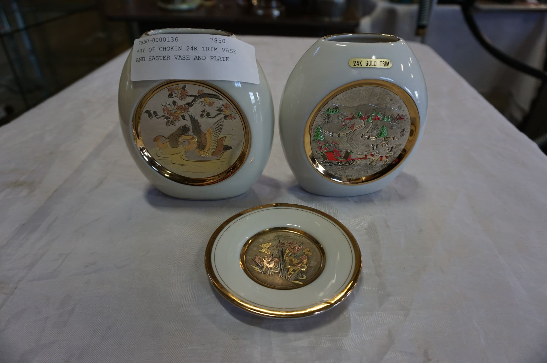 ART OF CHOKIN 24K TRIM VASE AND EASTER VASE AND PLATE
