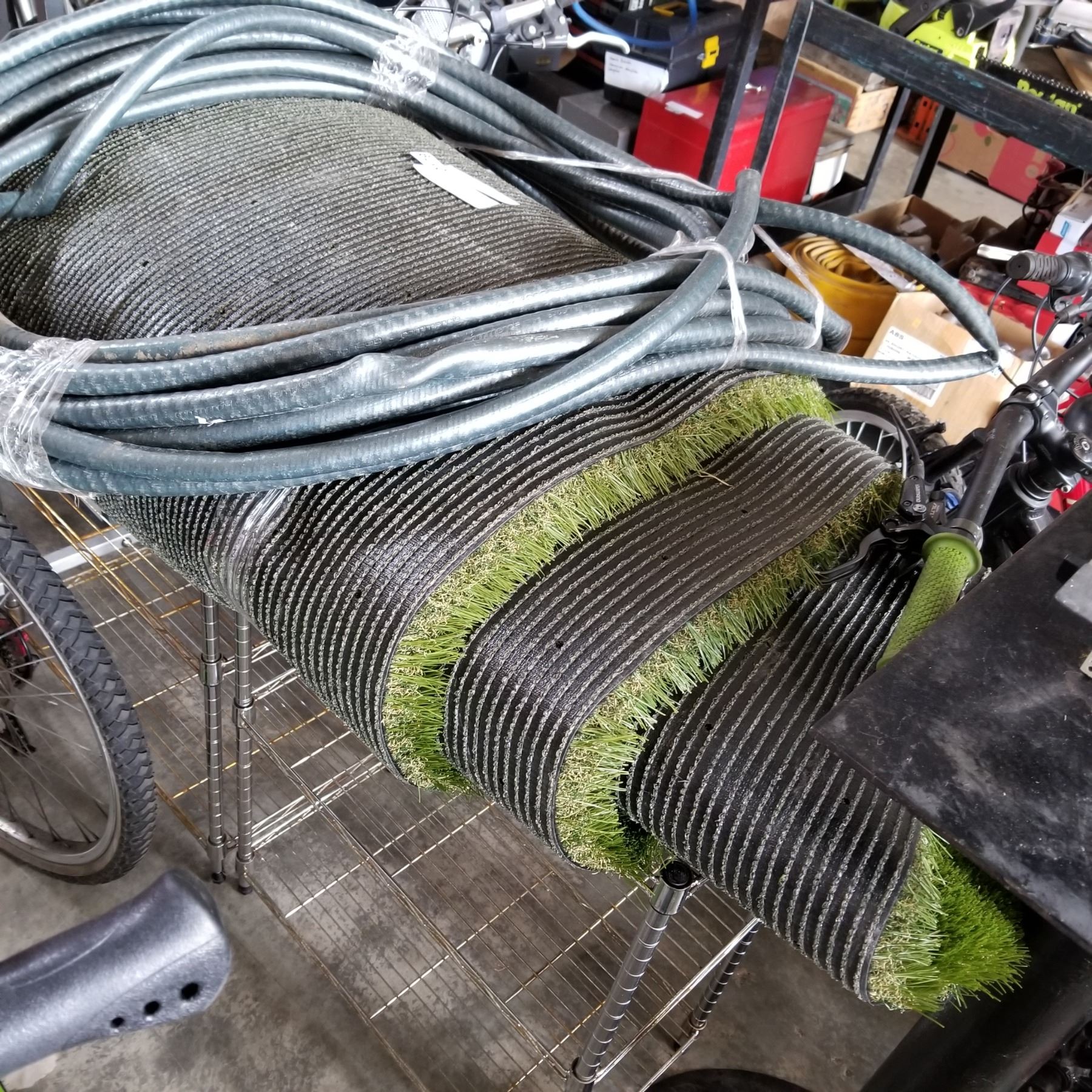 ARTIFICIAL GRASS CARPET 13FT x 41IN AND COMMERCIAL GARDEN HOSE APROX 100FT LONG, NEEDS ADAPTER