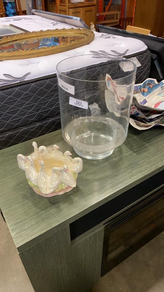 ARTIFICIAL PLANT, GLASS VASE AND SWAN FIGURES