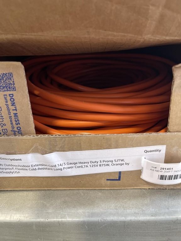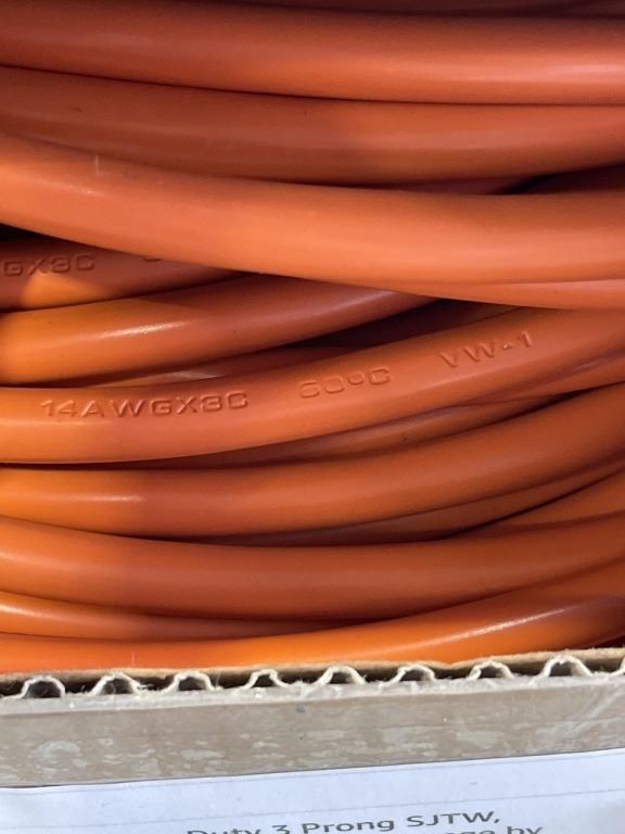 AS NEW 200FT INDOOR OUTDOOR 3 WIRE GROUNDED HEAVY DUTY LIGHTED EXTENSION CORD, ORANGE, 14AWG