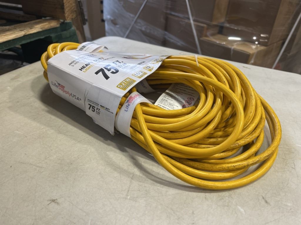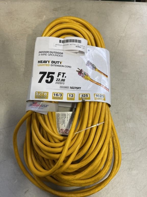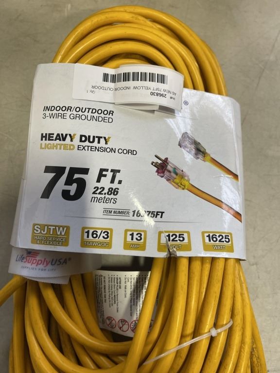 AS NEW 75FT YELLOW INDOOR OUTDOOR HEAVY DUTY LIGHTED 3 WIRE GROUNDED EXTENSION CORD 16AWG
