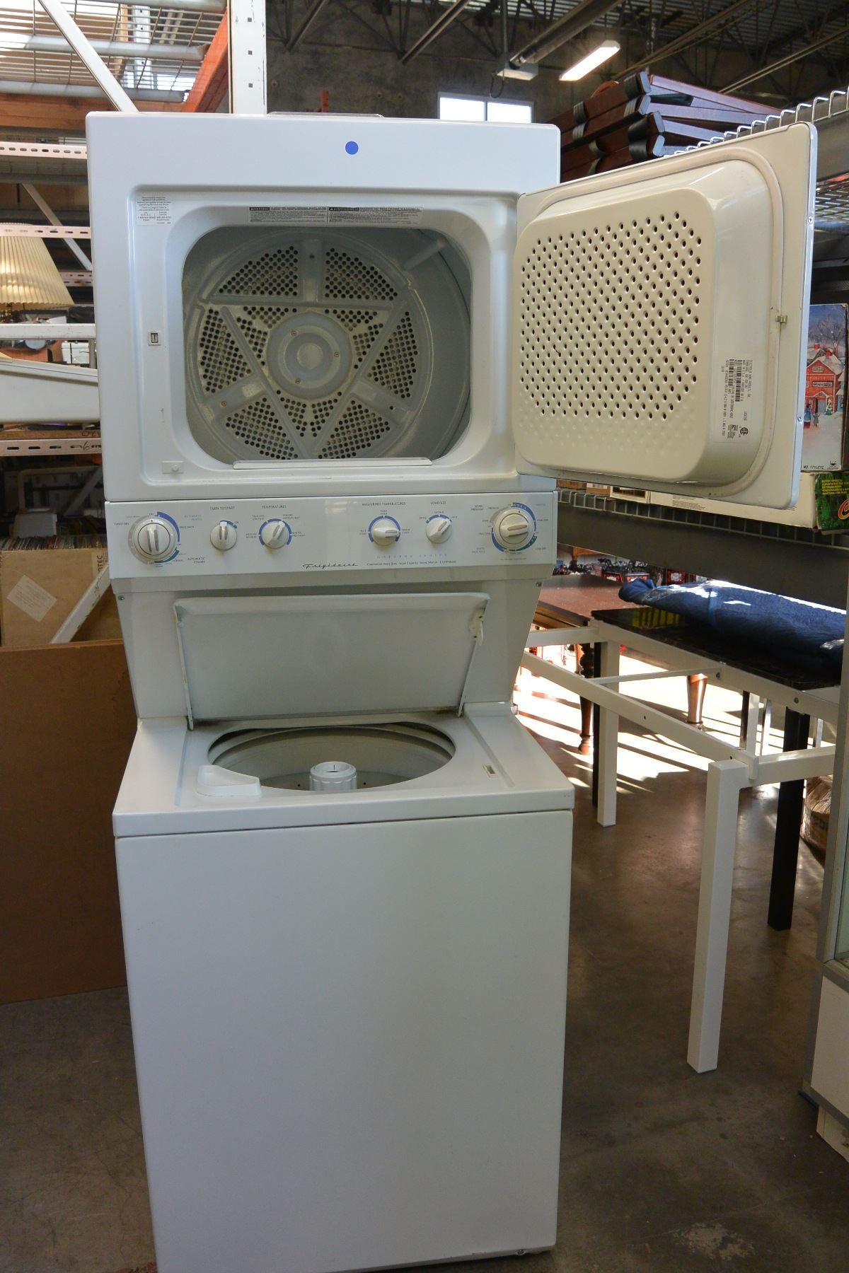 AS NEW FRIGIDAIRE WHITE GALERY SERIES STACKING WASHER DRYER
