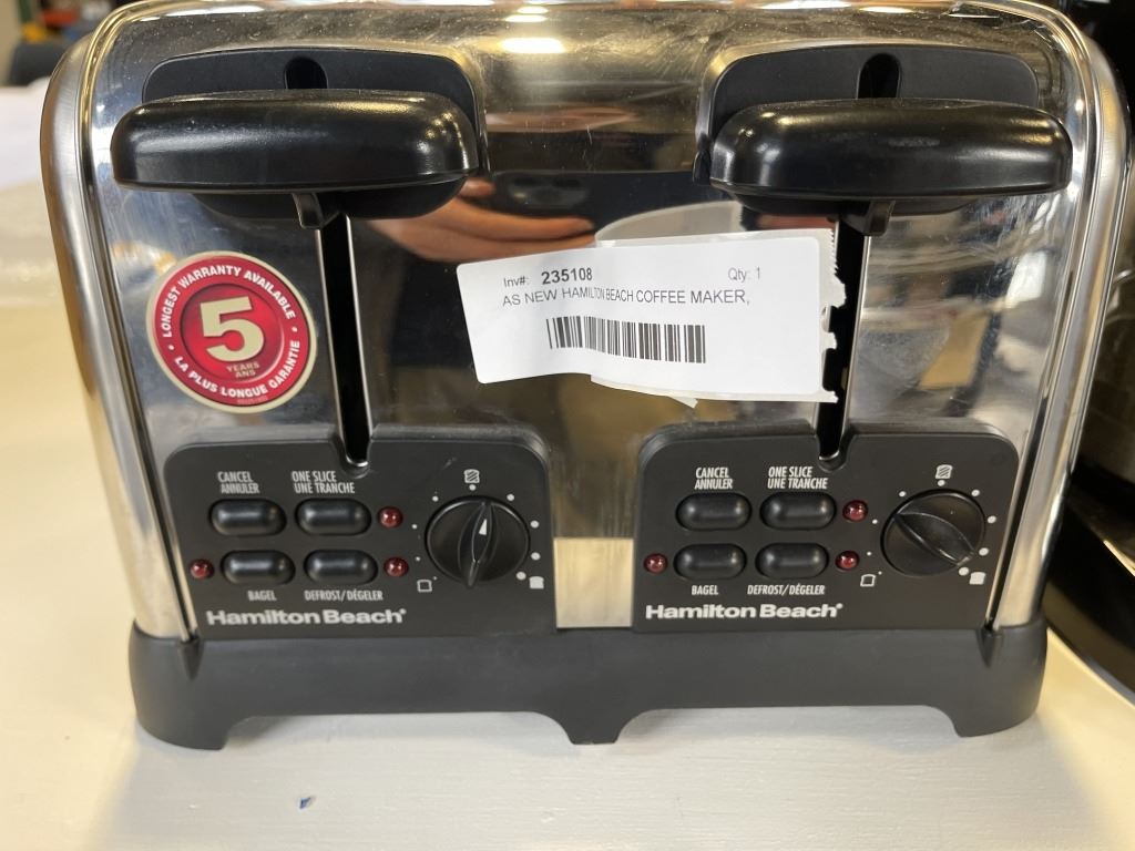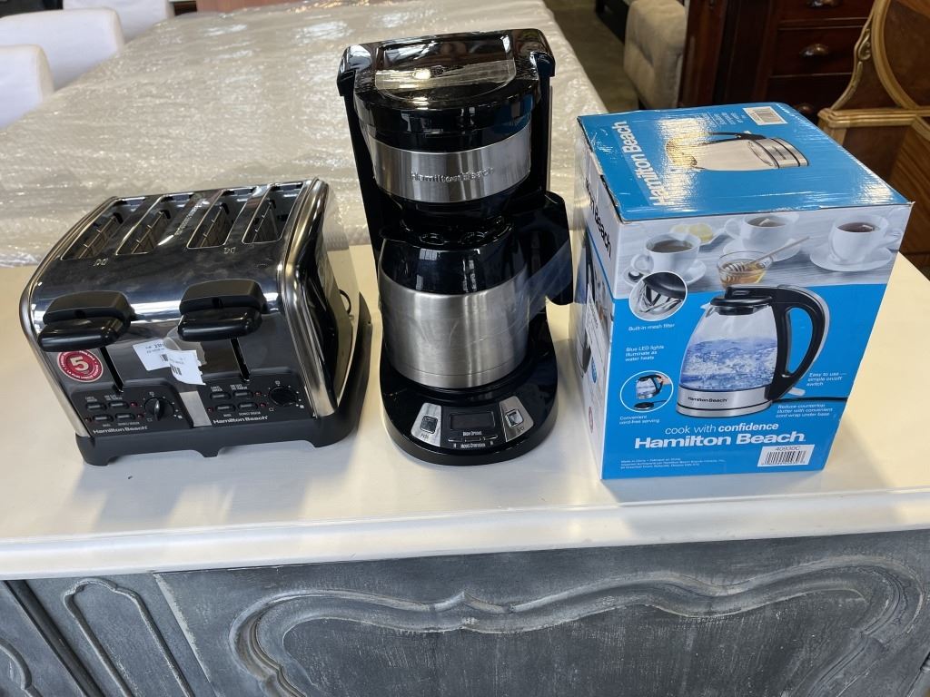 AS NEW HAMILTON BEACH COFFEE MAKER, 4 SLICE TOASTER AND HAMILTON BEACH ELECTRIC KETTLE