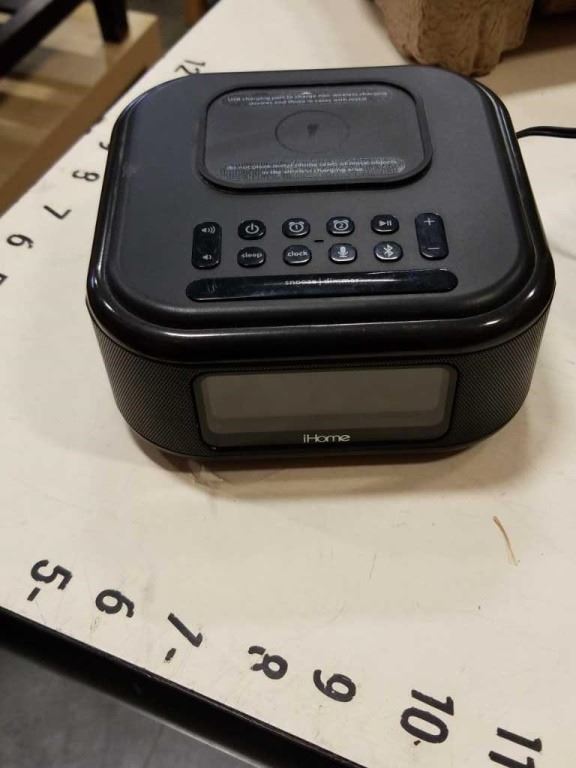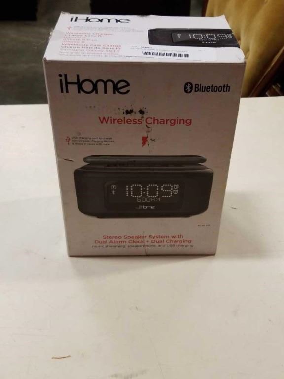 AS NEW IHOME STEREO SPEAKER WIRELESS CHARGING SYSTEM WITH DUAL ALARM CLOCK & DUAL CHARGING