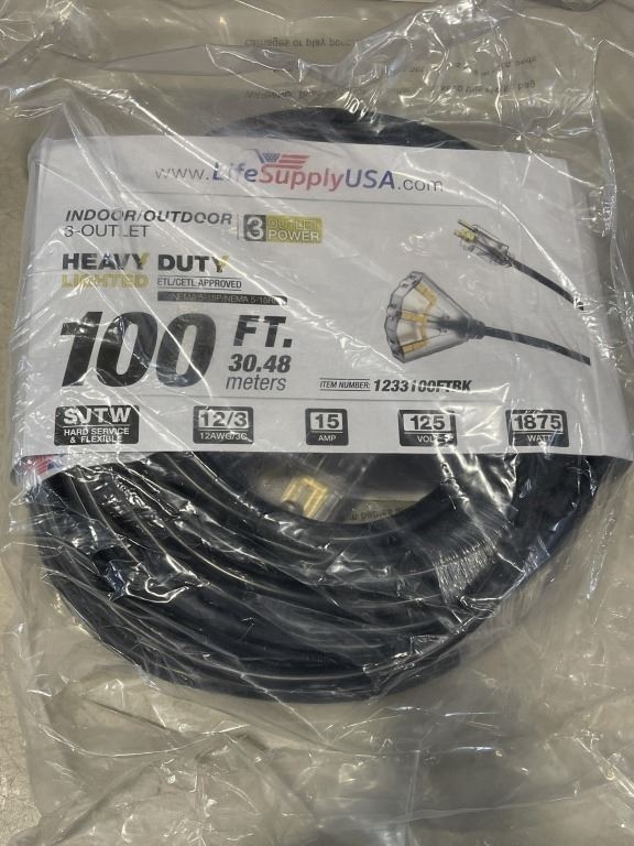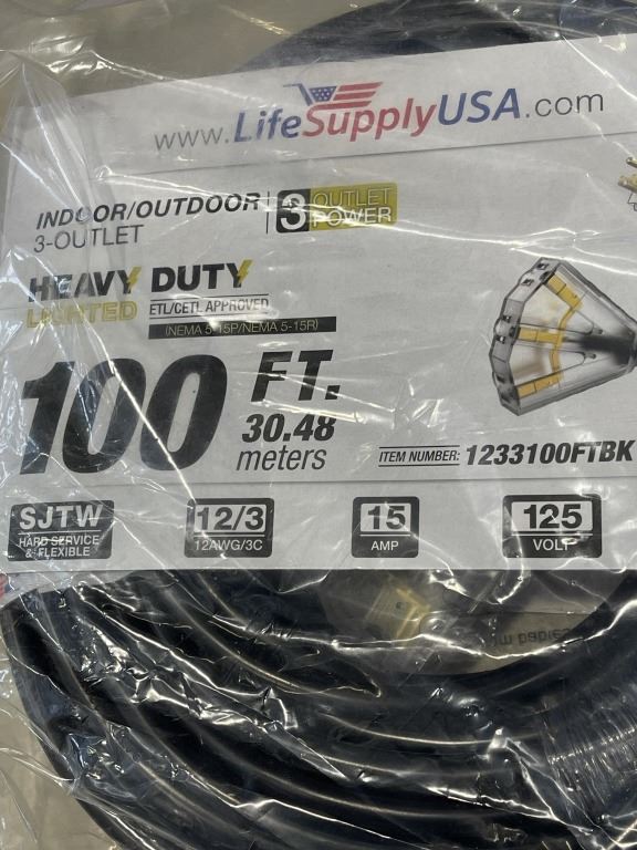 AS NEW INDOOR/OUTDOOR 3 POWER OUTLET 100FT 12 AWG 15 AMP BLACK EXTENTION CORD