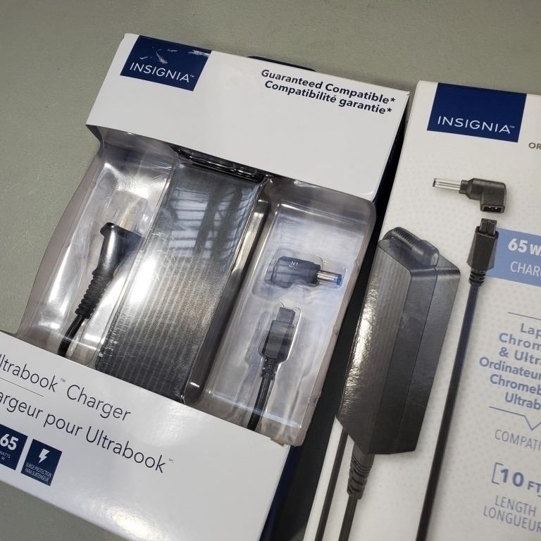 AS NEW INSIGNIA 65 WATT UNIVERSAL LAPTOP CHARGER AND 65 WATT ULTRABOOK CHARGER