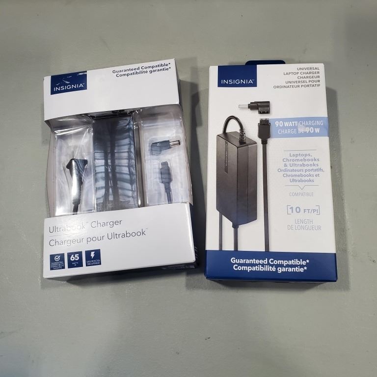 AS NEW INSIGNIA 90 WATT UNIVERSAL LAPTOP CHARGER AND 65 WATT ULTRABOOK CHARGER