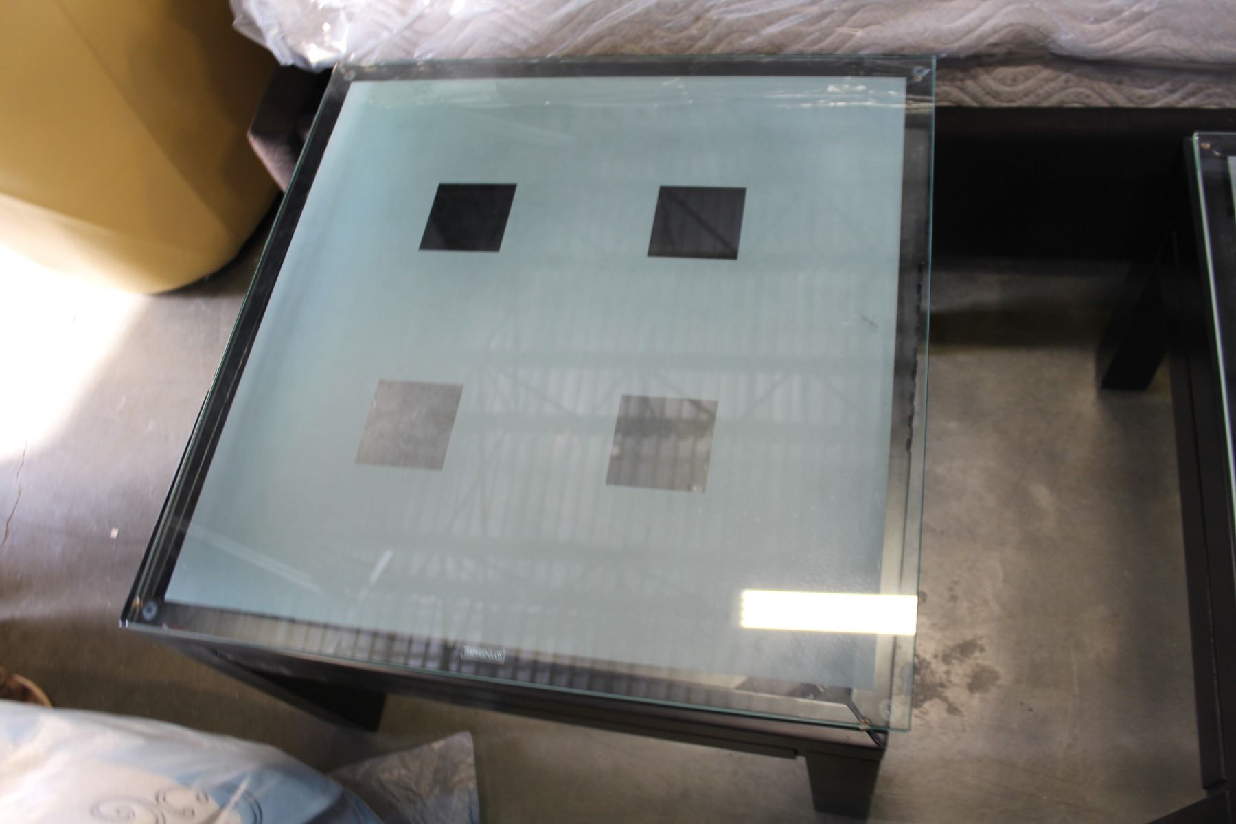 AS NEW MODERN BLACK AND GLASS TOP COFFEE AND ENDTABLE