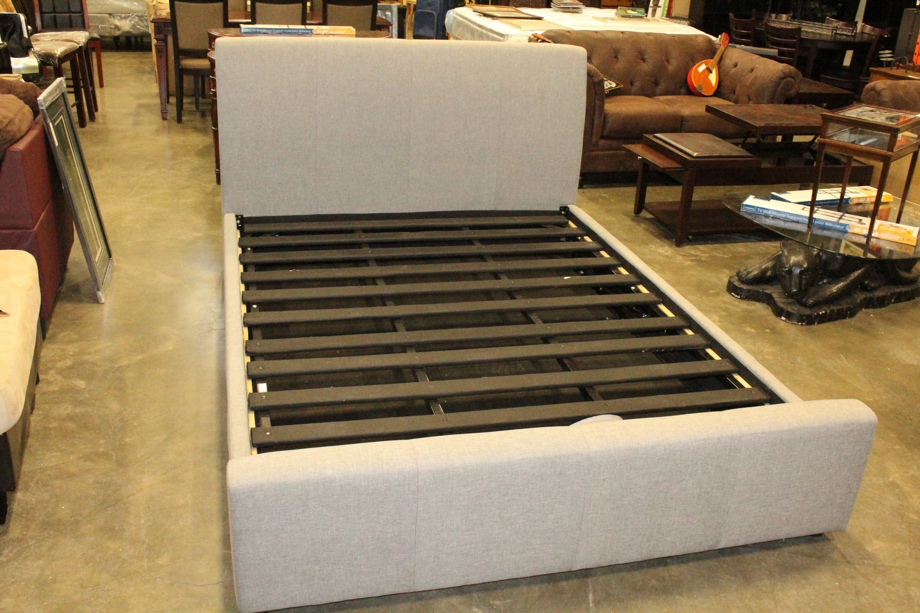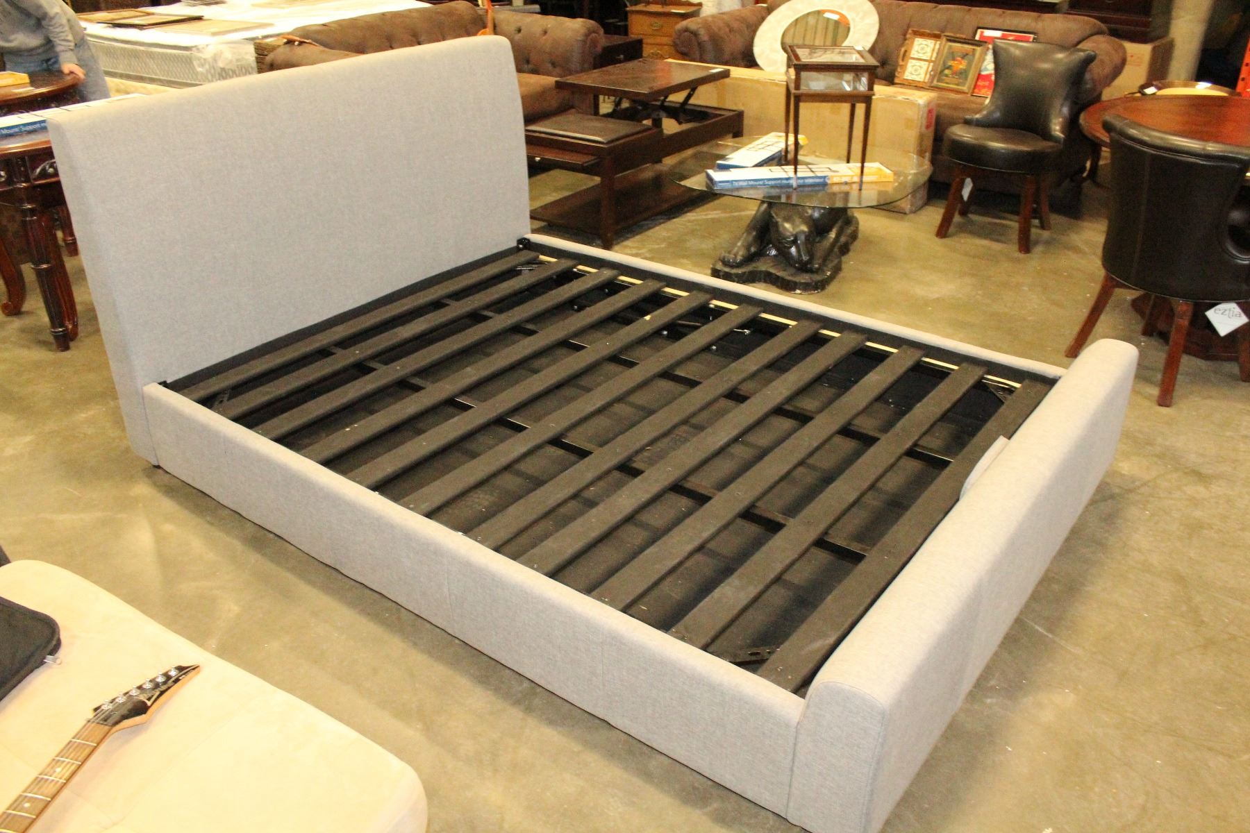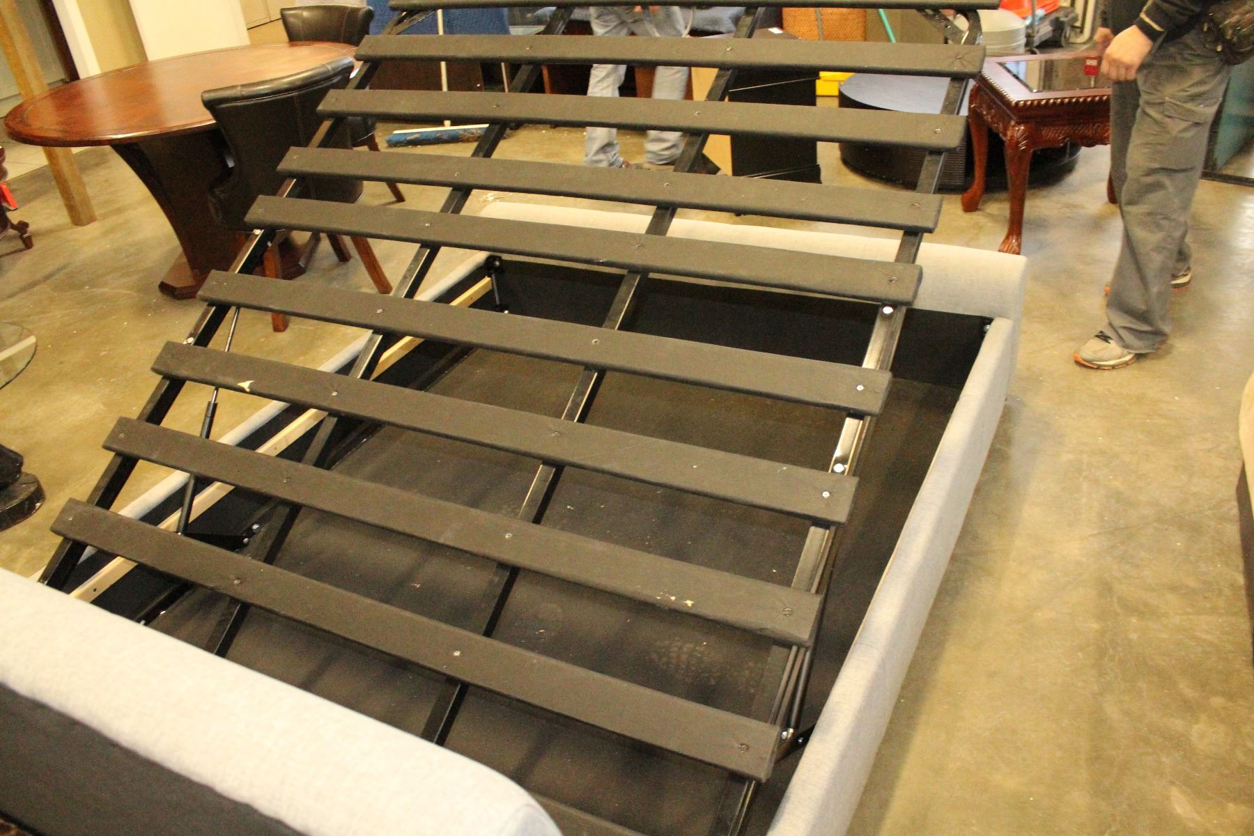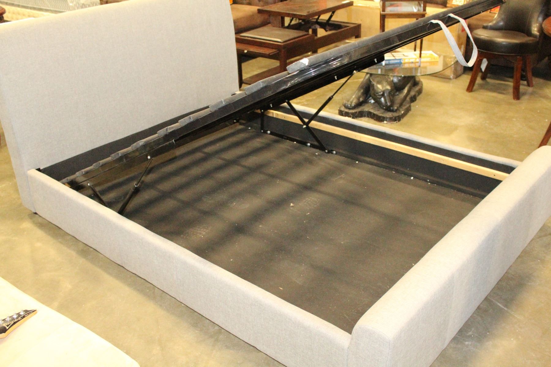 AS NEW QUEENSIZE GREY MODERN PLATFORM BEDFRAME WITH HYDARAULIC LIFT FOR UNDER STORAGE RETAIL $1899