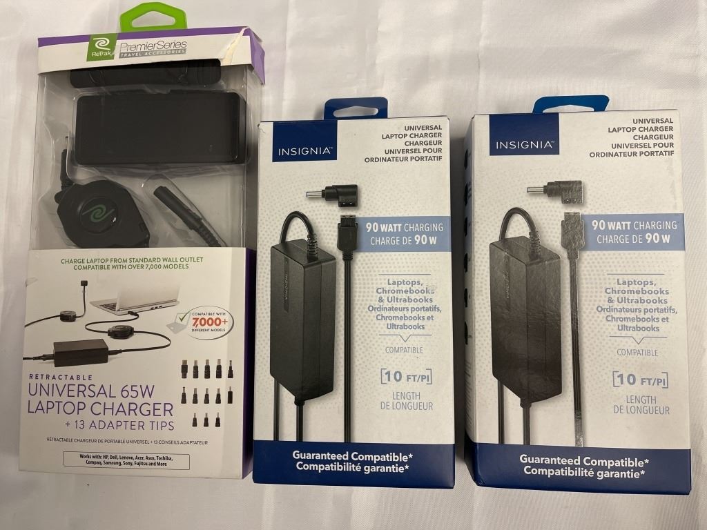 AS NEW UNIVERSAL RETRACTABLE LAPTOP CHARGERS AND 2 90 WATT UNIVERSAL LAPTOP CHARGERS TOTAL RETAIL VALUE $220
