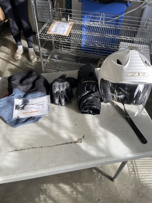 AS NEW Z1R SIZE SMALL MOTORCYCLE HELMET WITH VISOR, SET OF GLOVES AND RAIN PANTS