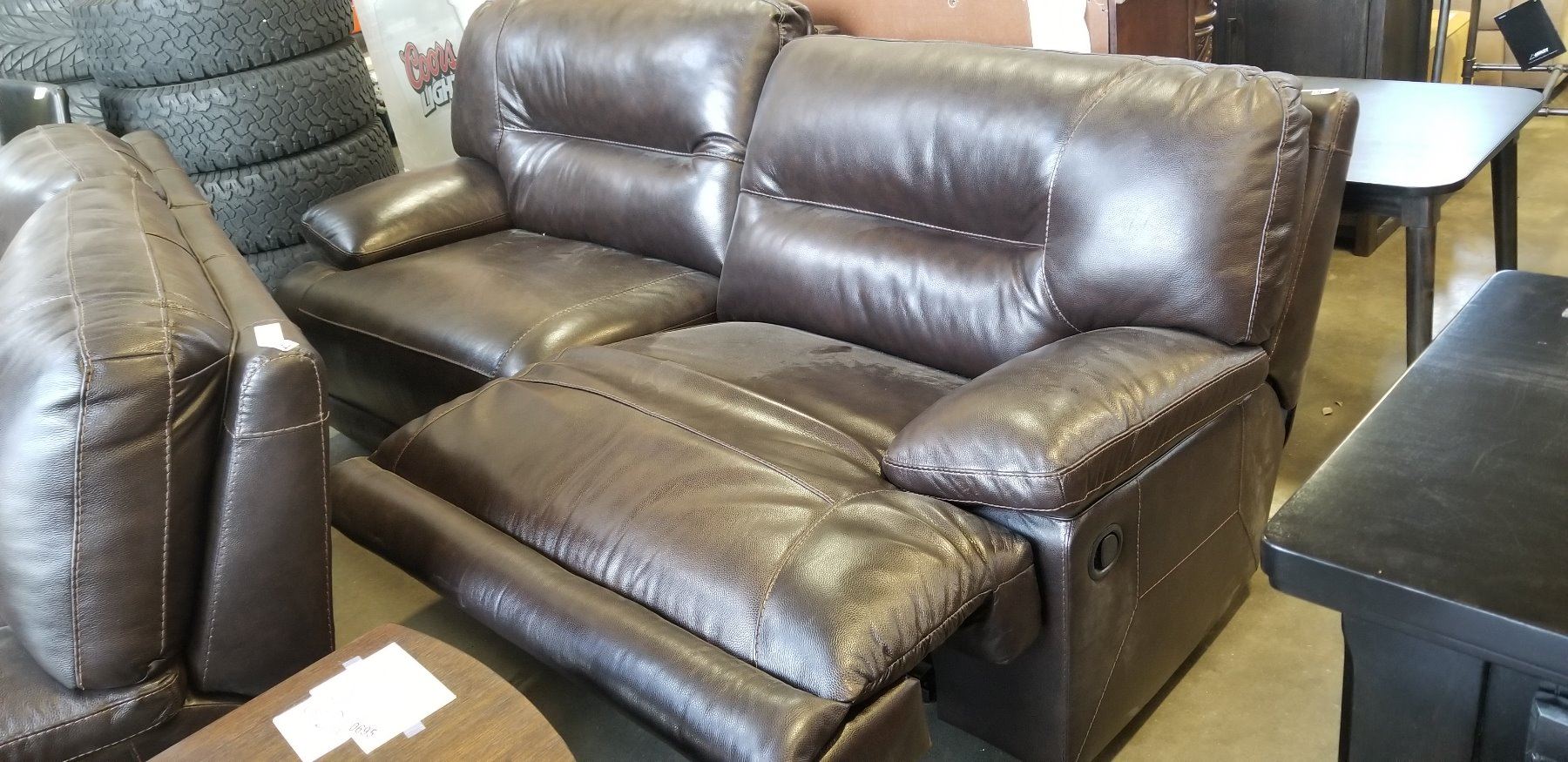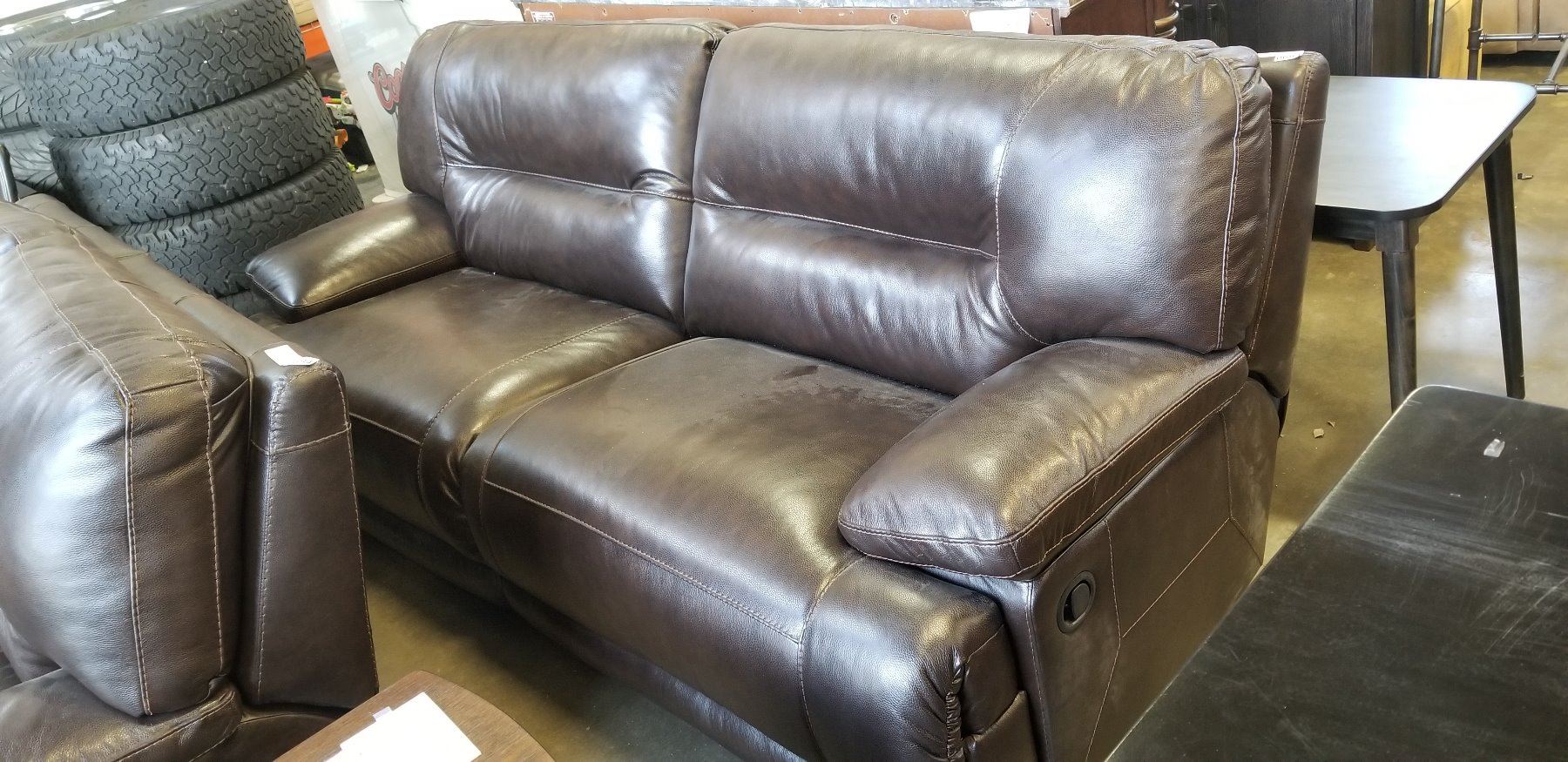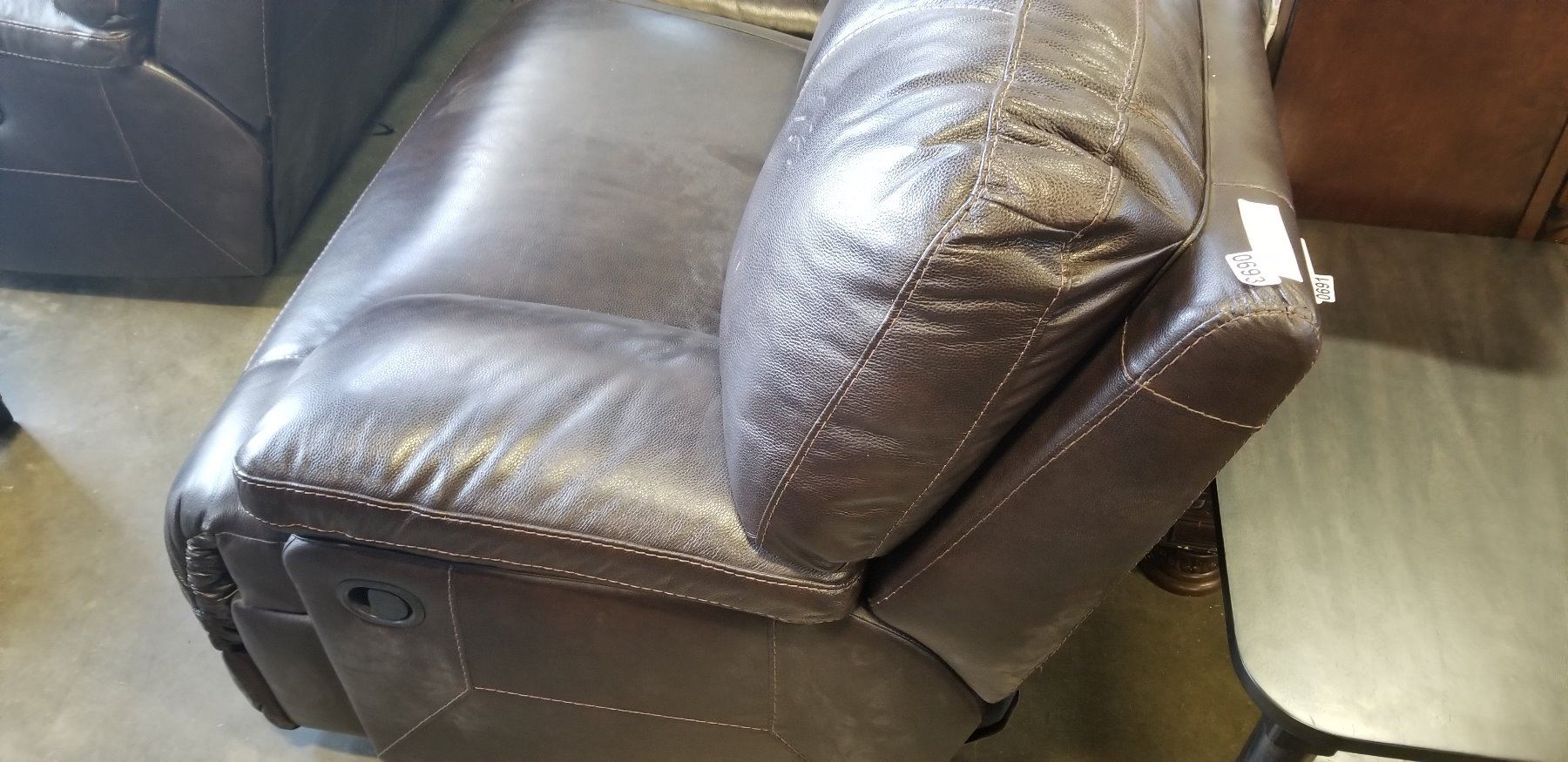 ASHLEY BROWN STITCHED GENUINE LEATHER RECLINING SOFA, RETAIL $1990